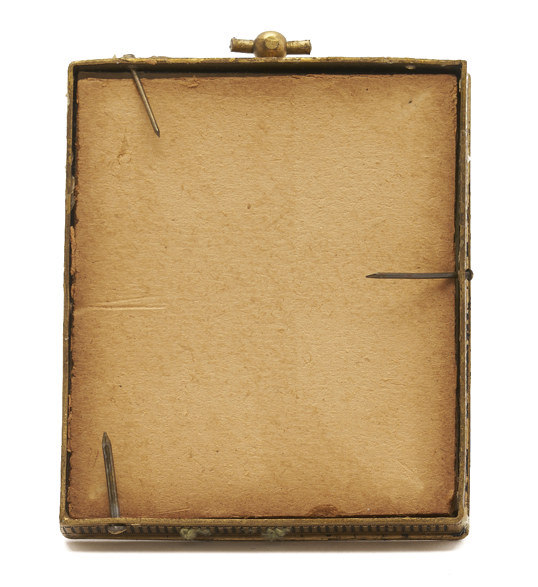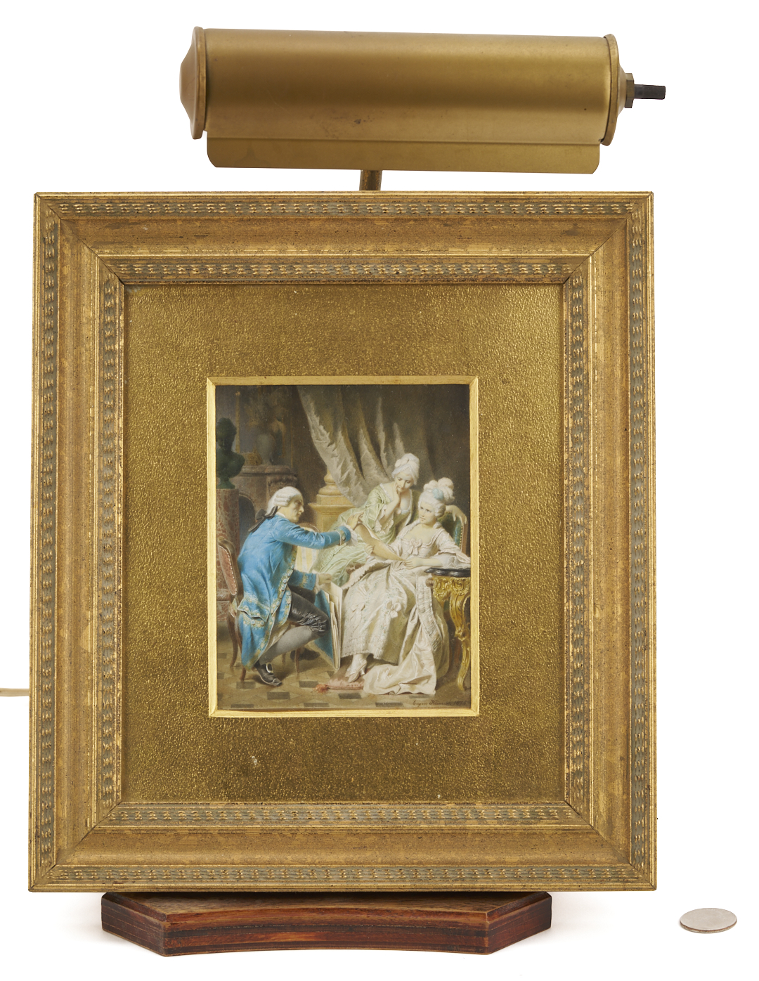 American School Miniature Portrait plus a Eugen Klimsch Genre Scene with lighted stand. 1st item: Eugen Johann Georg Klimsch (German, 1839-1896) miniature watercolor on paper genre scene depicting a gentleman in 18th century clothing handing a letter to a lady, seated and attended by another woman, in an elegant interior setting with drape, column and urn in the background. Signed Eugen Klimsch and dated 1878 lower right. Housed in a later giltwood frame with gilt mat, under glass. Sight: 5 1/2 in. H x. 4 in. W. Frame: 11 1/2 in. H x 10 1/2 in. W. Together with a lighted display stand, 14 in. H x 8 in W x 7 in. D. 2nd item: American school miniature watercolor portrait depicting a man dark coat with yellow vest and white tie, seated before a red drape and column. Unsigned. In rectangular gilt metal frame. Sight: 2 3/4 in. H x 2 1/4 in. W. Framed: 3 3/16 in. H x 2 11/16 in. W. Early 19th century.