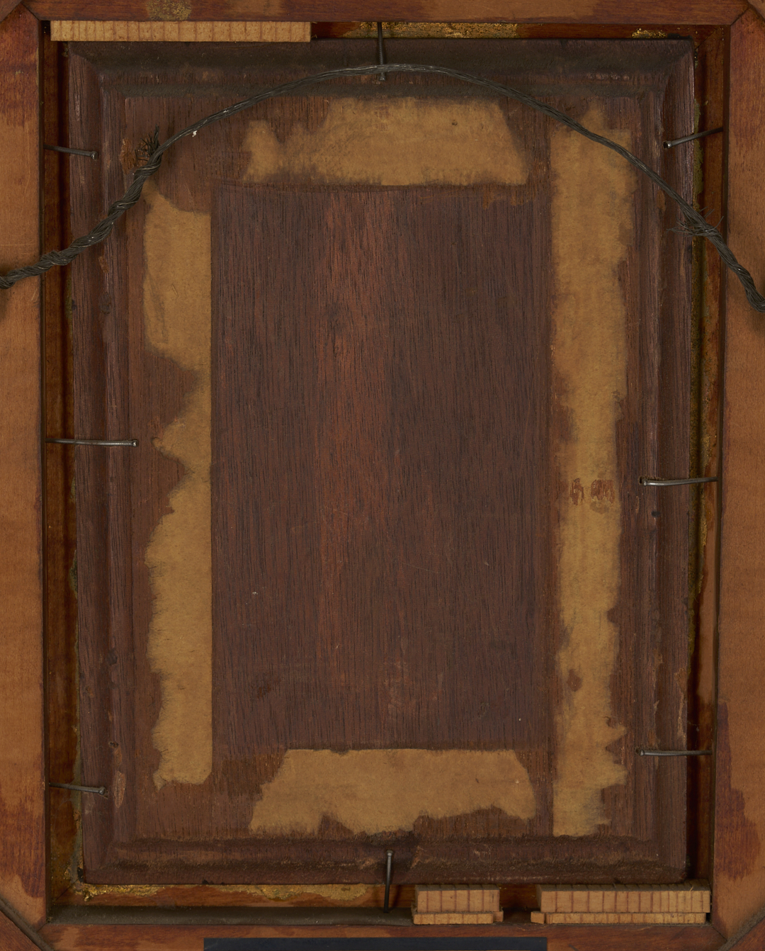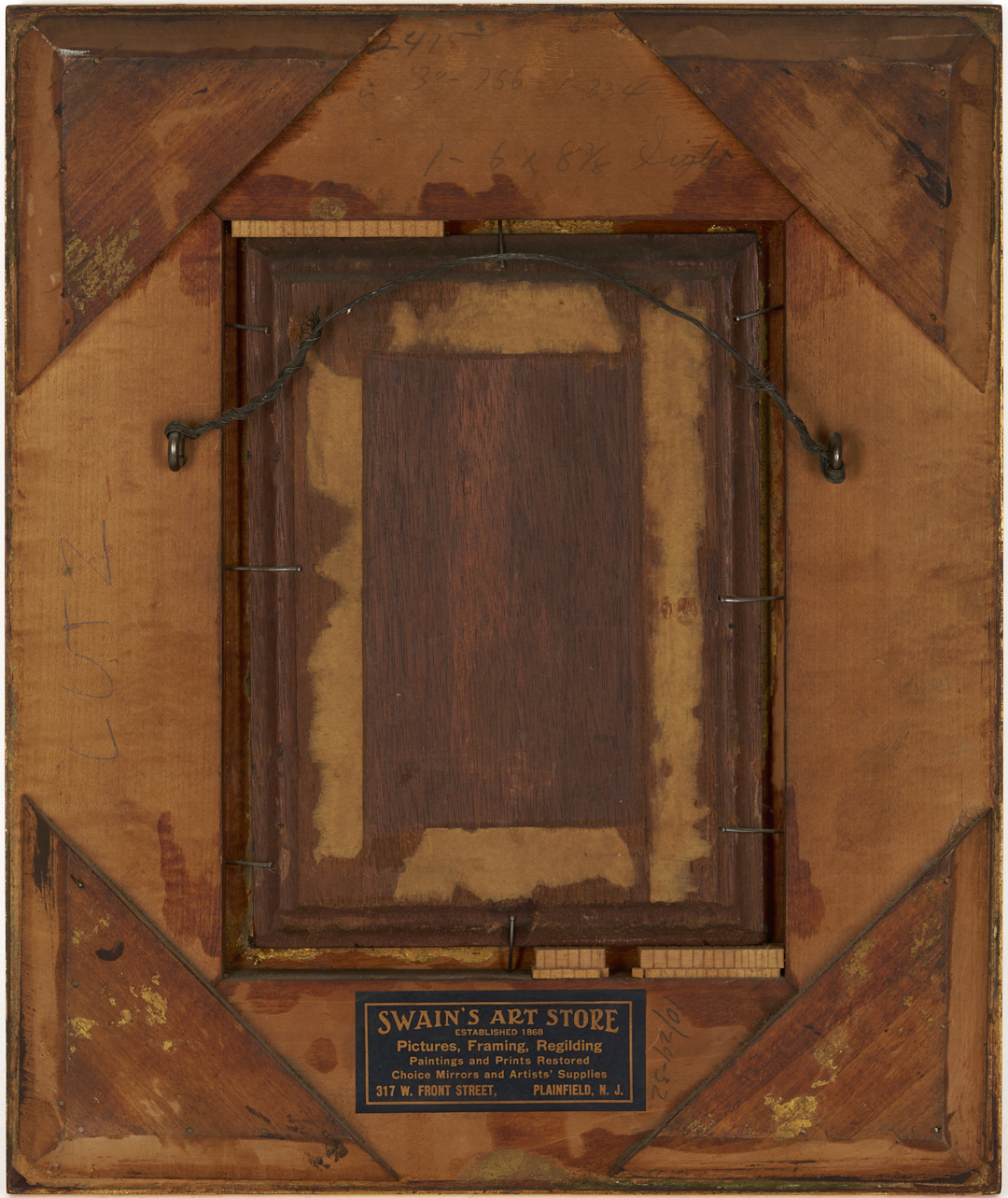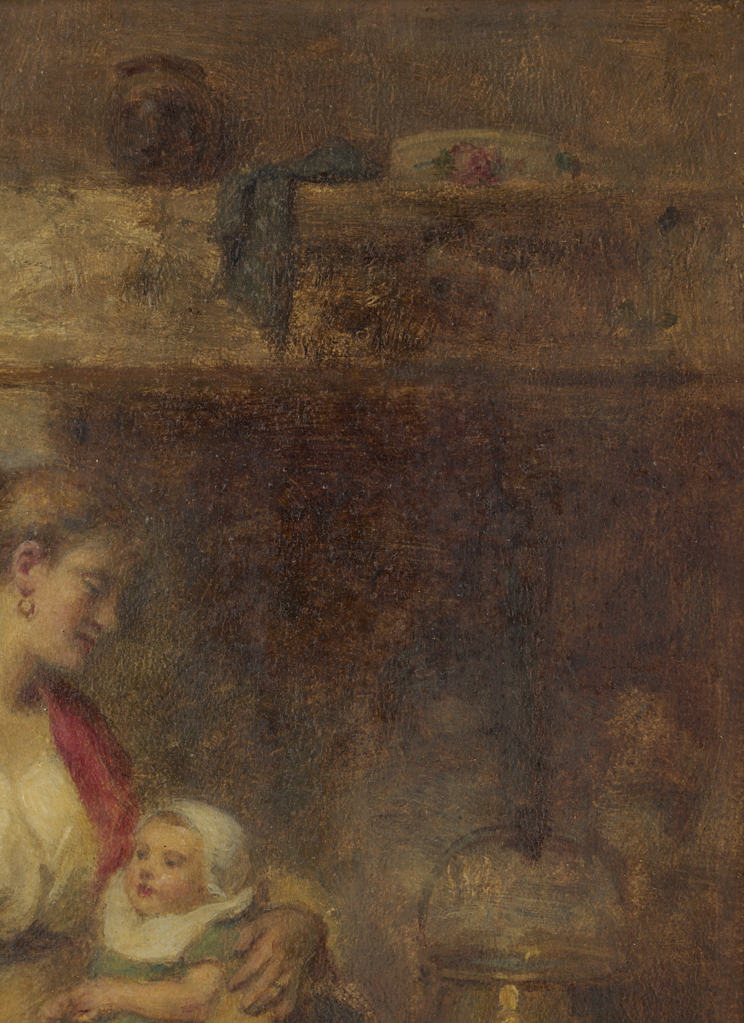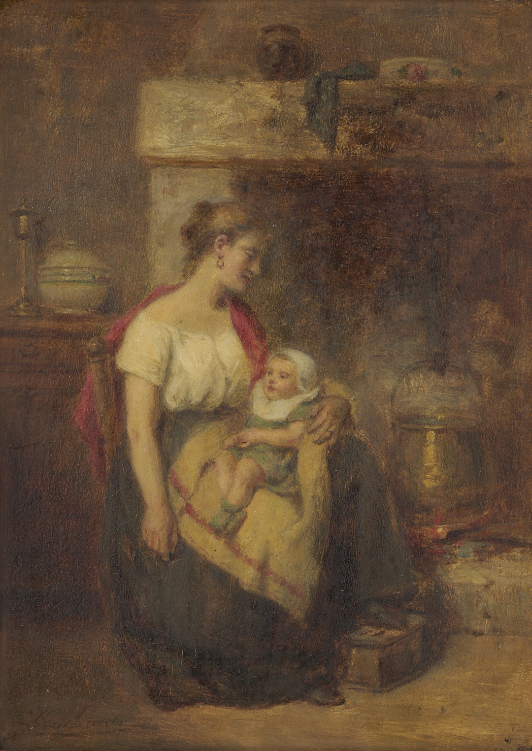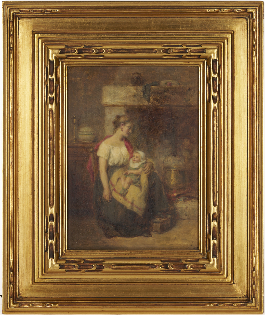 Leon Emile Caille (French, 1836-1907) oil on panel painting of a woman seated in a domestic interior, 19th c. She holds a small child on her lap and places her left foot on a footwarmer while a kettle warms over a fire at right. Signed lower left. With Swain’s Art Store, Plainfield, NJ label affixed to verso. Housed in a giltwood frame. Sight: 8 1/4 in. H x 5 7/8 in. W. Framed: 14 1/2 in. H x 12 in. W.