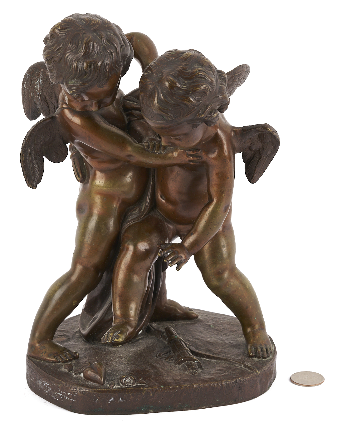 German bronze by R. Bellair & Company, Berlin, depicting two playful cherubs on an oval base with a heart, bow, and quivers at their feet. R.Bellair & Company foundry mark on the top of the base, 10 1/2 in. H x 7 in. W x 5 3/4 in. D. Late 19th/Early 20th century.