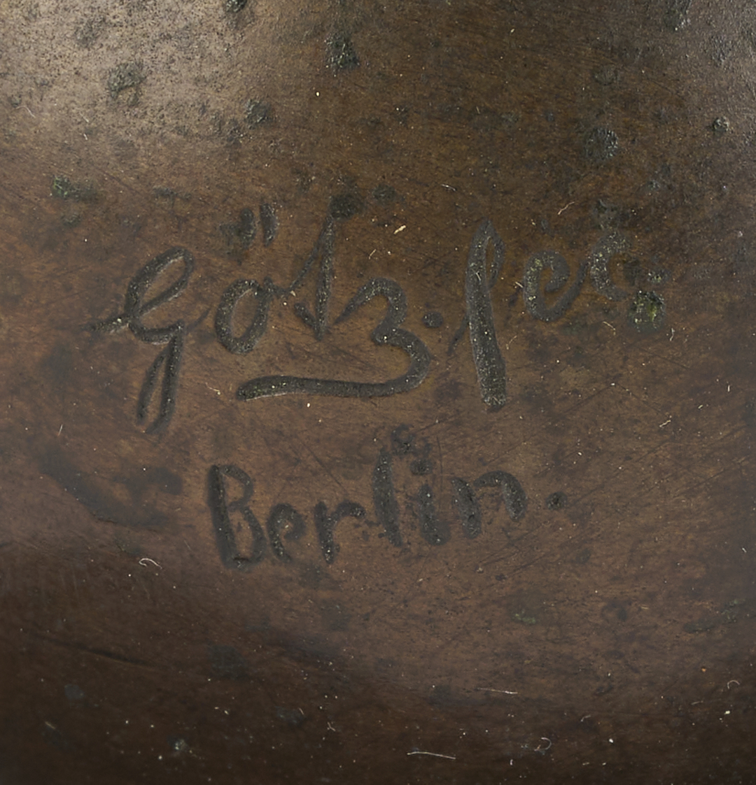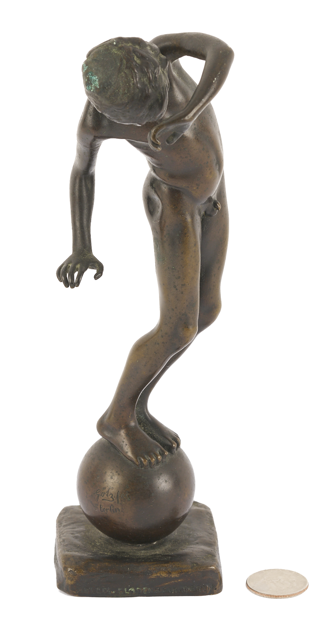 Johannes Gotz (Germany, 1865 – 1934) bronze sculpture, depicting a young male balancing on a ball. Signed on the side of the ball “Gotz, fec. Berlin” with additional foundry mark for Aktien-Gesellschaft Gladenbeck operating in Berlin from 1851 to 1926. 9 1/4 in. H.