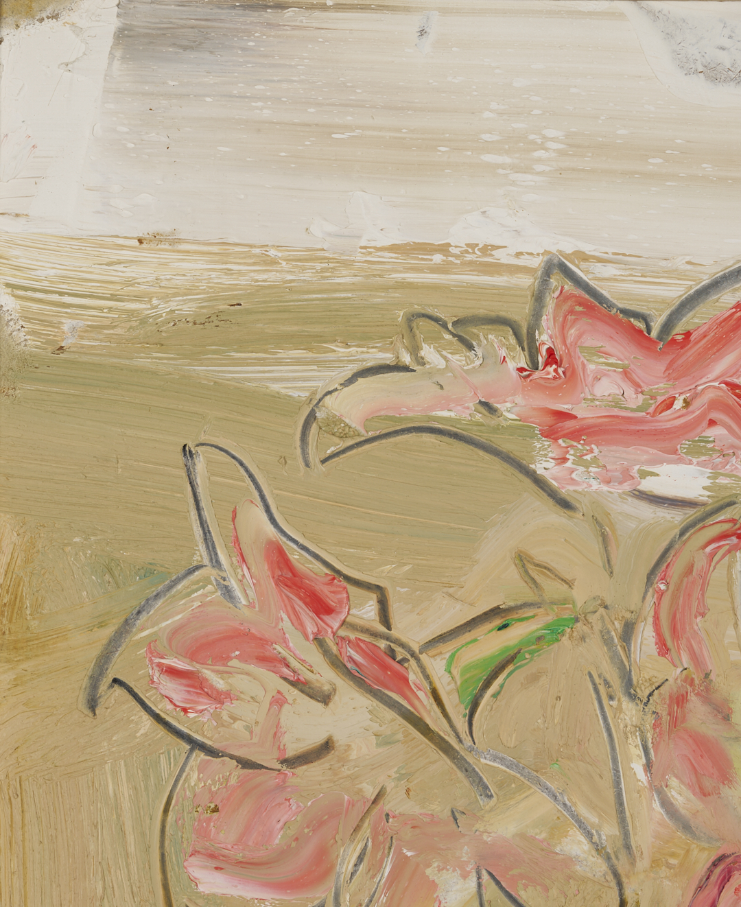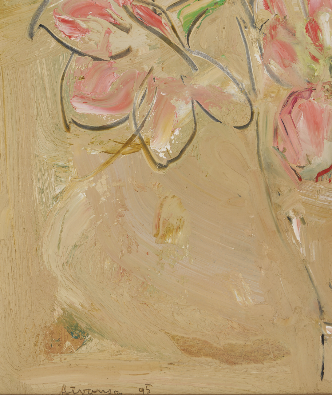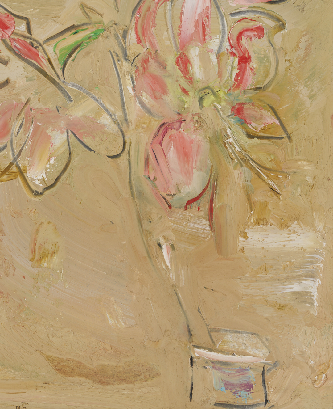 Sterling Boyd Strauser (American, 1907 – 1995), oil on board, still life painting depicting three red flowers in a clear glass vase set against a pale yellow or tan background. Signed and dated ’95 lower left. Housed in a carved gilt wood frame. Sight: 15 1/4 in. H x 11 1/8 in. W. Framed: 18 1/4 in. H x 14 5/8 in. W.