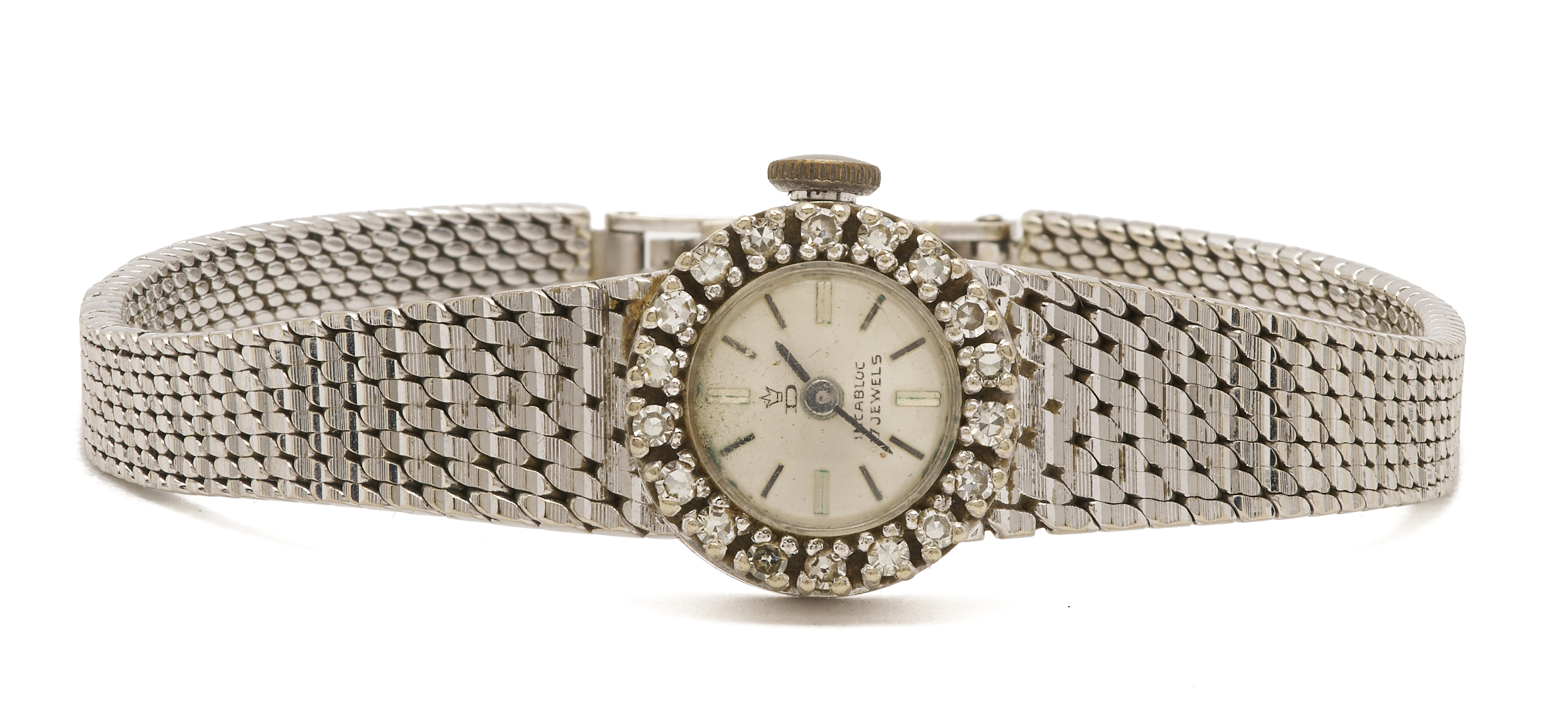 Ladies 14K white gold 17 jewel wrist watch by Incabloc featuring eighteen (18) single cut melee diamonds. The watch is marked “0.585 14K” and XRF tests 14K gold. The watch is 7 in. L. and has a gross weight of 24.95 grams.