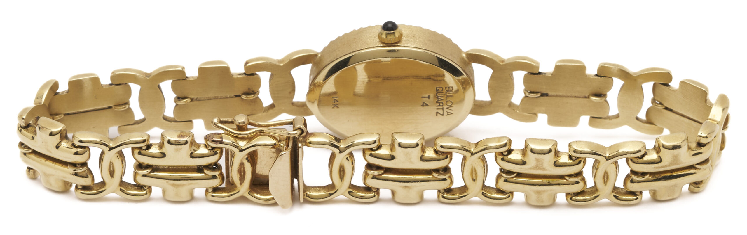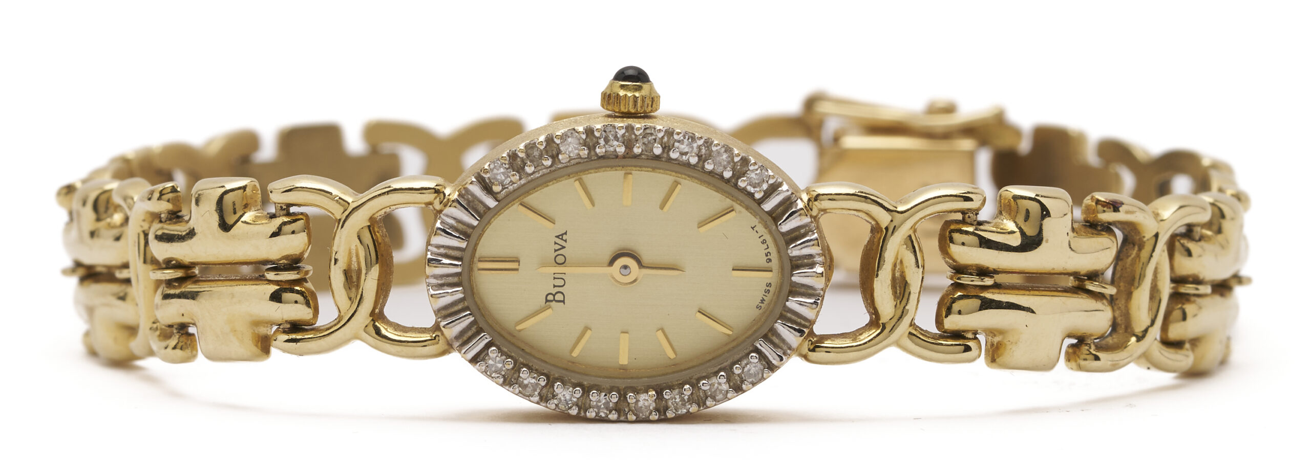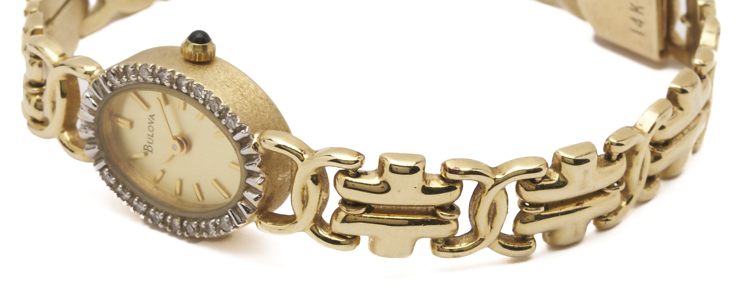14K yellow gold Bulova quartz wrist watch featuring sixteen (16) single cut melee diamonds. The watch is marked “14K Quartz Bulova” and XRF tests 14K gold. The watch is 7 in. L. and has a gross weight of 18.55 grams.