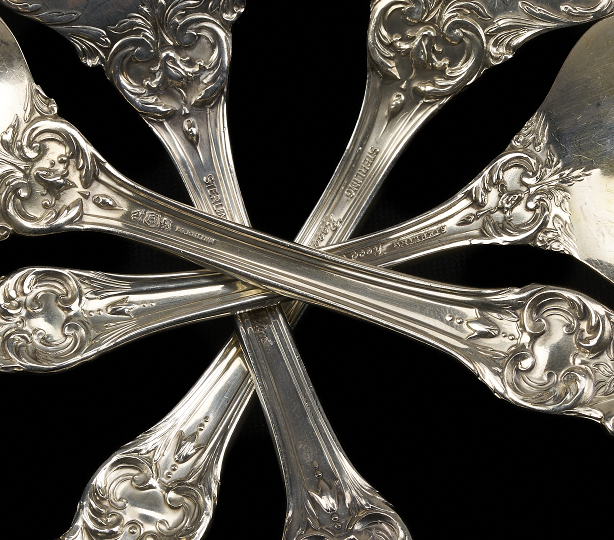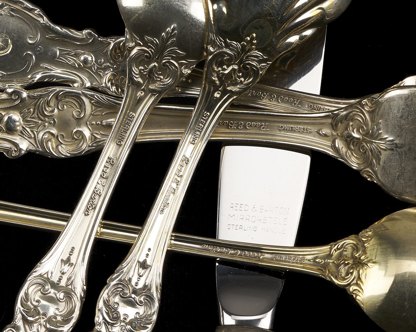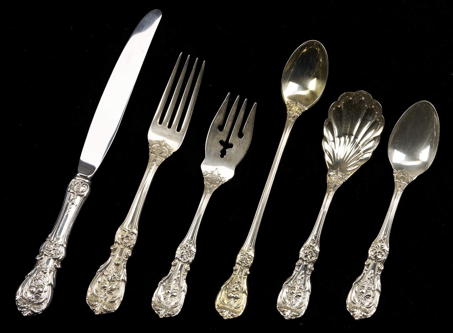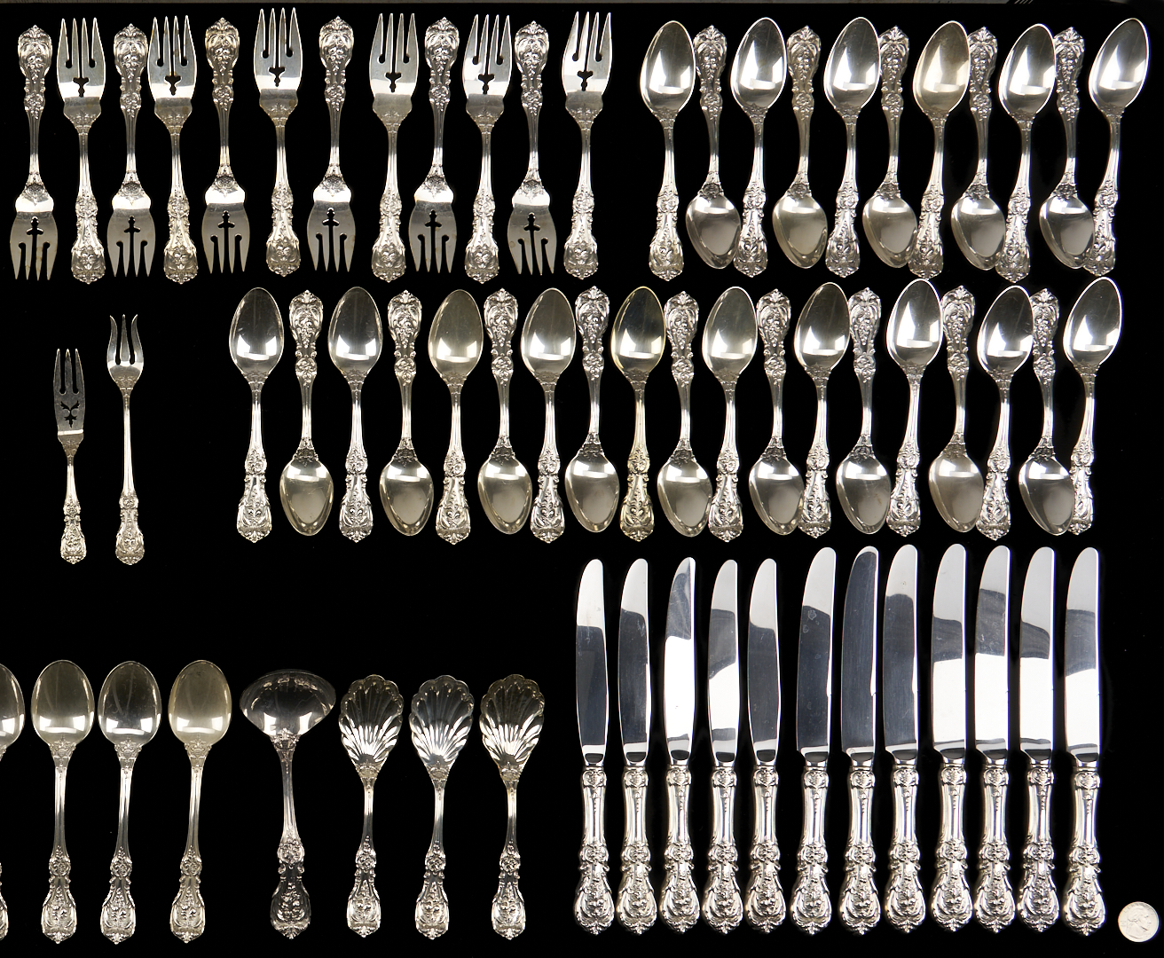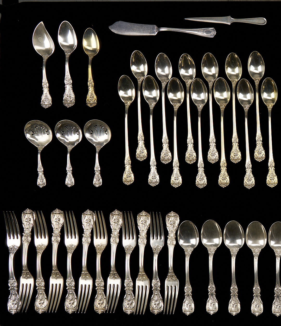 One hundred thirteen (113) pieces Reed & Barton Francis I sterling silver flatware, including: 12 dinner knives (8 7/8 in. L), 12 salad forks, 12 dinner forks (7 1/4 in. L), 31 teaspoons, 8 soup spoons, 13 iced teaspoons, 4 serving spoons, 3 sugar shells, 3 bon bon spoons, 1 tomato server, 1 lettuce fork, 1 serving fork, 1 cold meat fork, 1 gravy ladle, 1 jelly slice, 1 lemon fork, 2-pc. child’s set, 2-pc. carving set, 1 master butter, 1 cake server, 1 pie server, and 1 cheese server. 141.04 total weighable troy ounces.