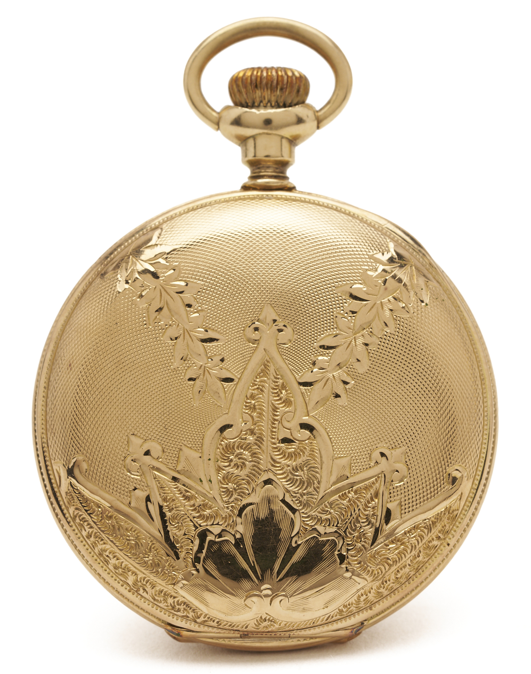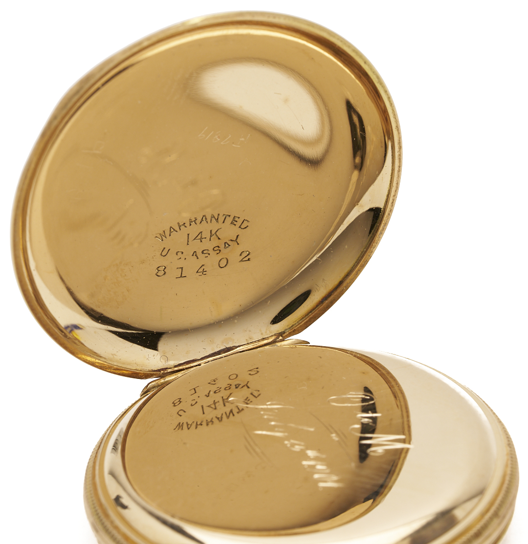 Elgin grade 222 7 jewel size 0s pocket watch. The watch is in a 14K yellow gold hunting case with arched trefoil and garland engraving. The case is marked “14K” and XRF tests 14K gold. The serial number is 9075255 and was produced in 1901. Gross weight of the watch is 30.13 grams.
