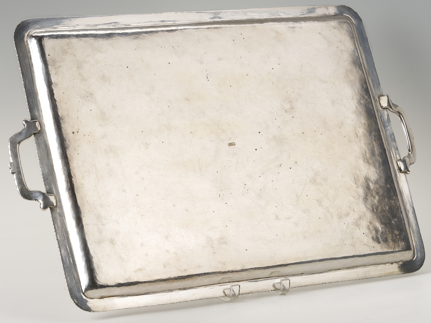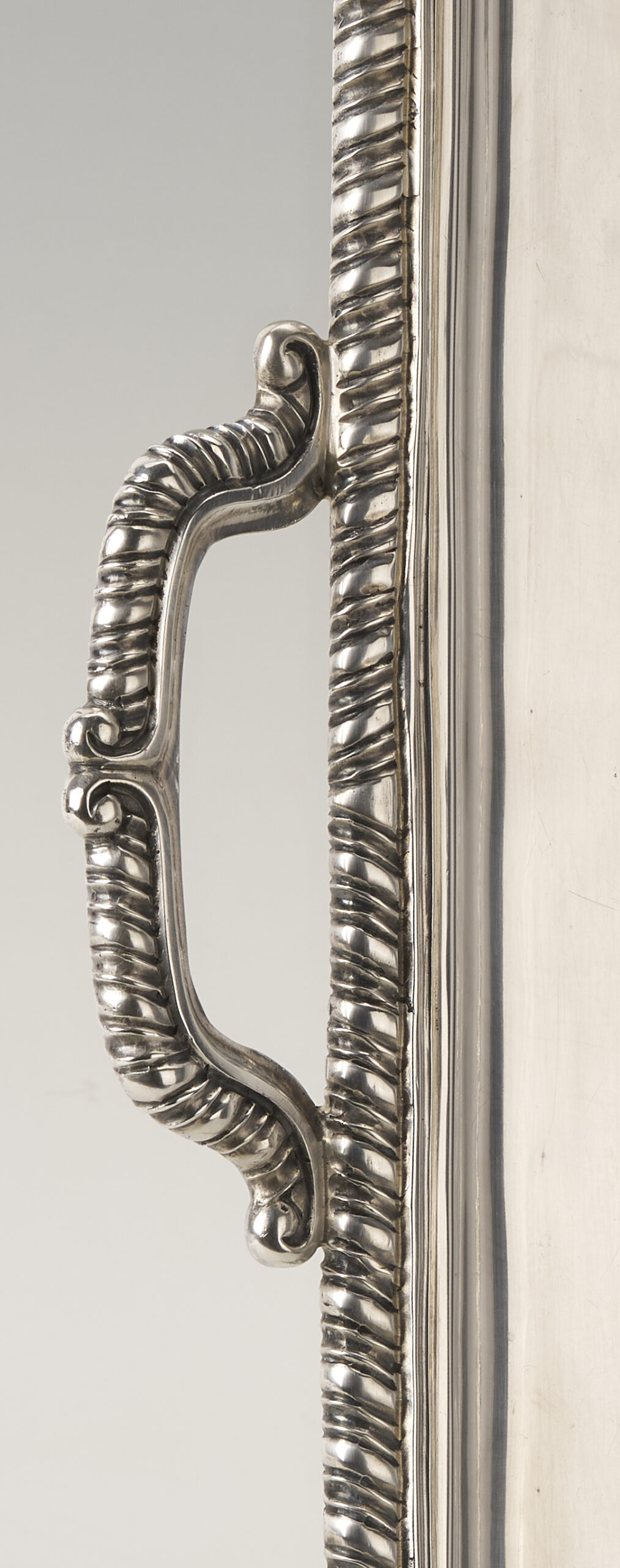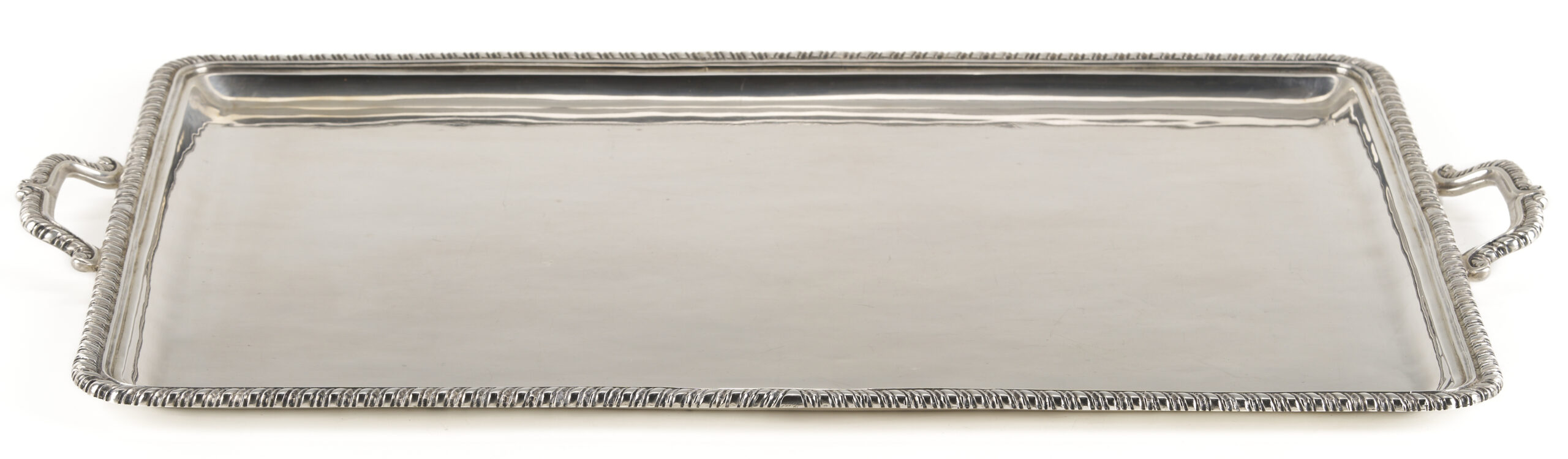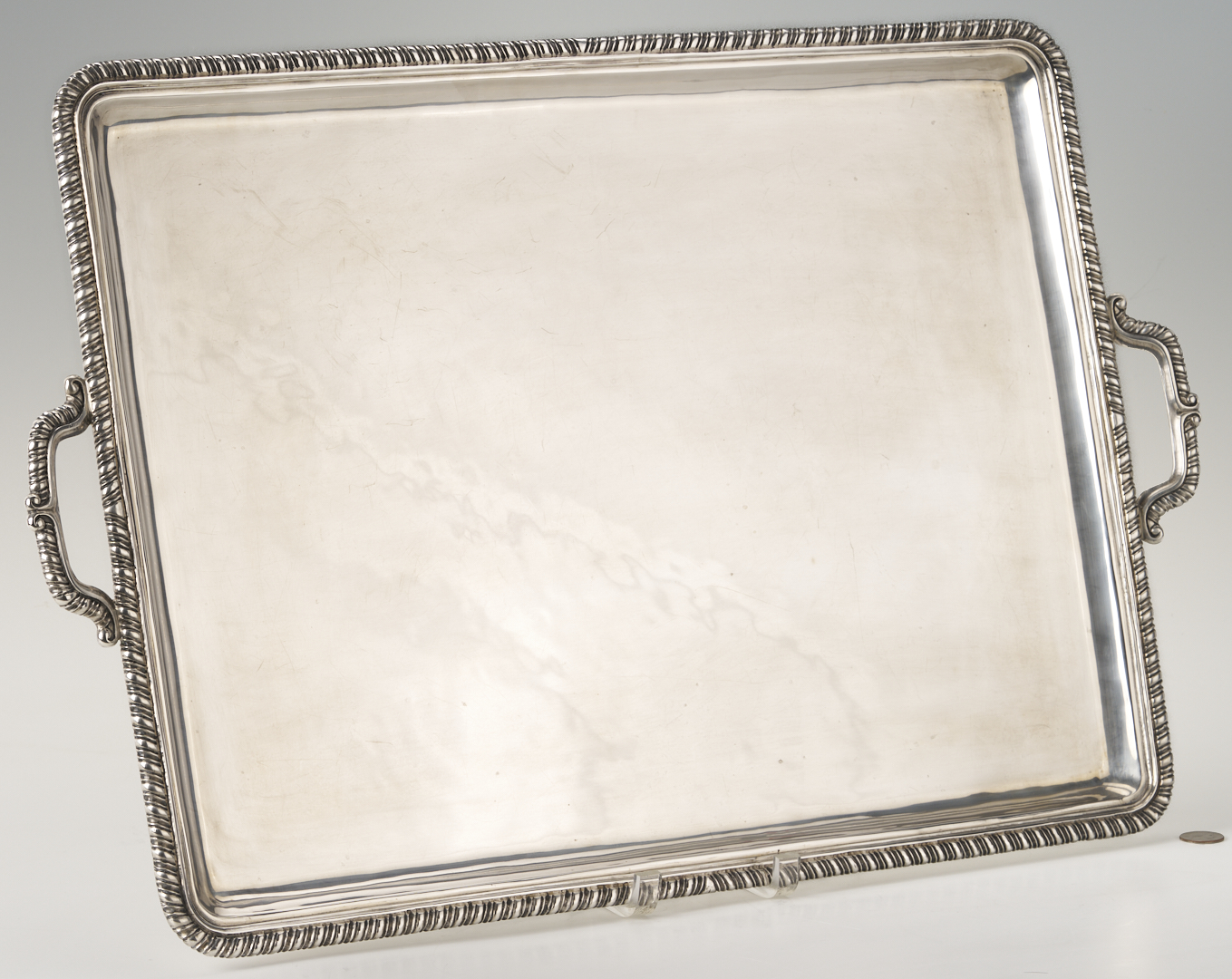 A large Mexican Sanborns sterling silver tray, handled rectangular form with gadrooned border and handles. Sanborns’ hallmarks, “Sterling” and “Mexico” stamped on the base. 17 3/4 in. H x 27 3/8 in. W. 141.2 oz. troy.