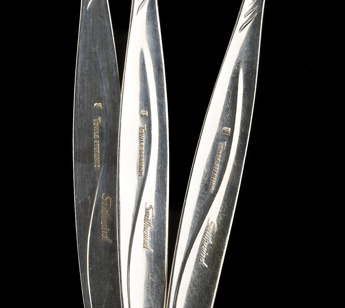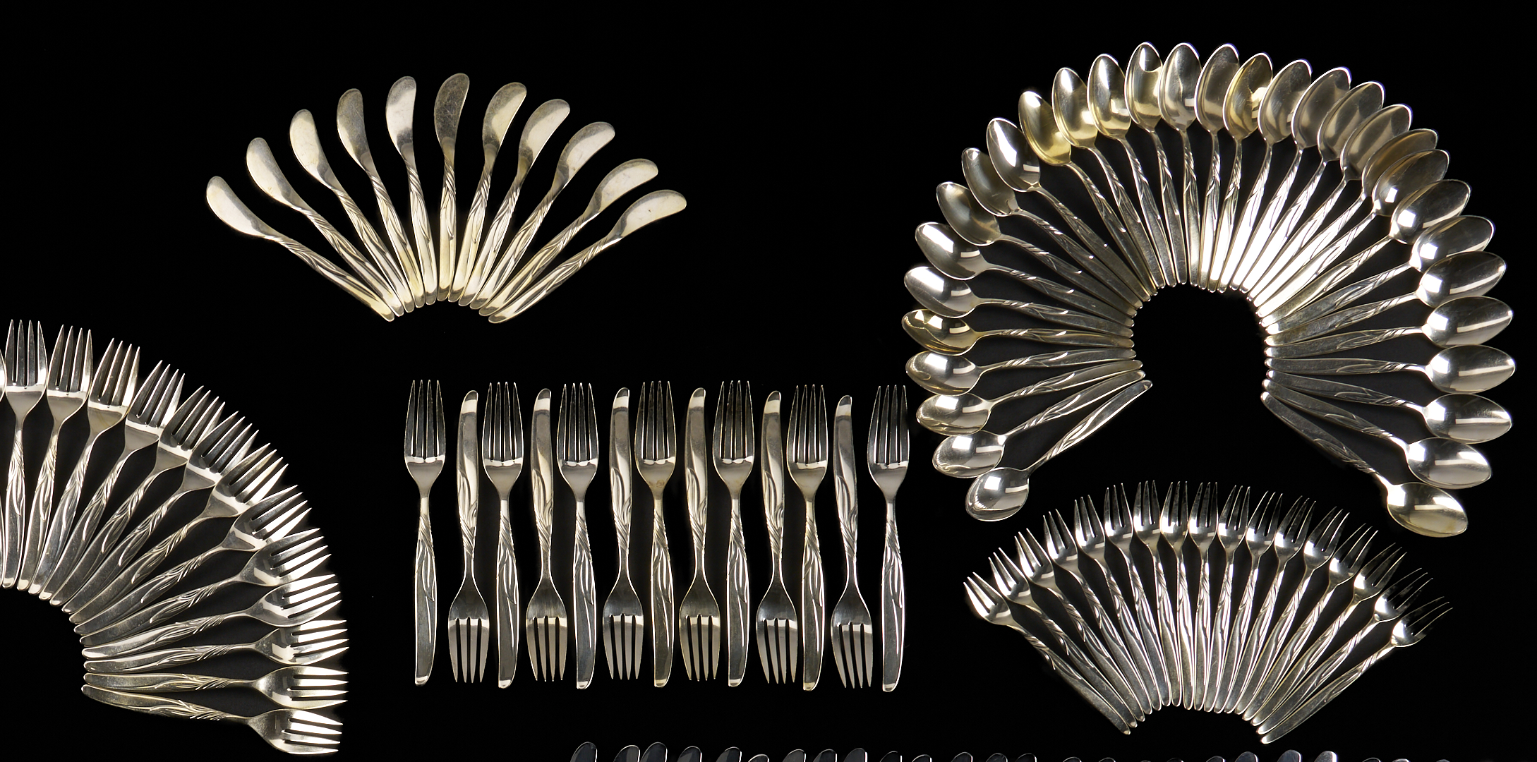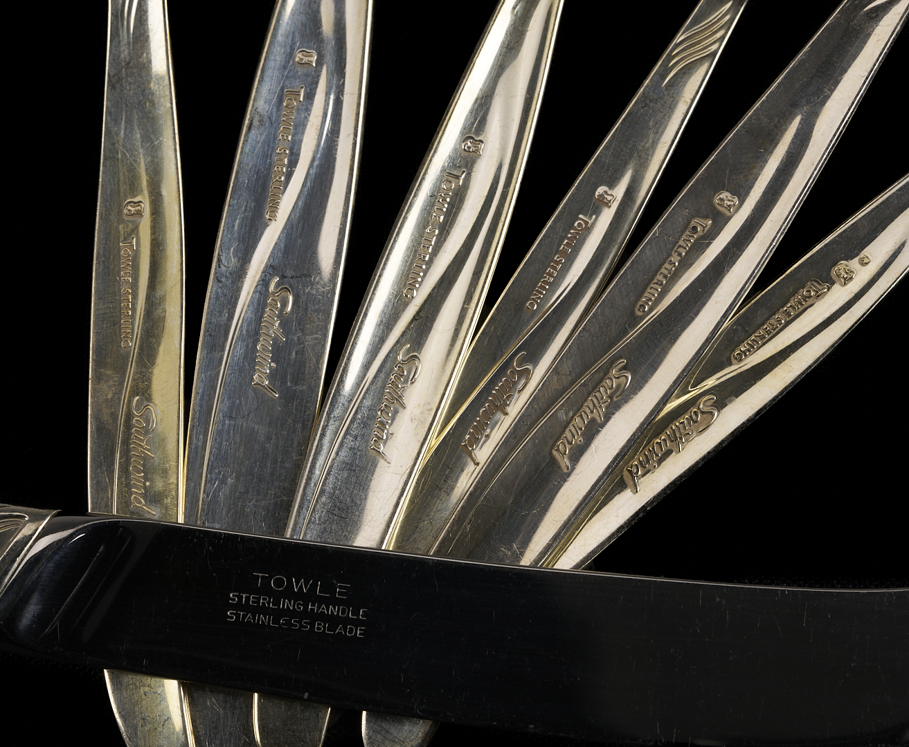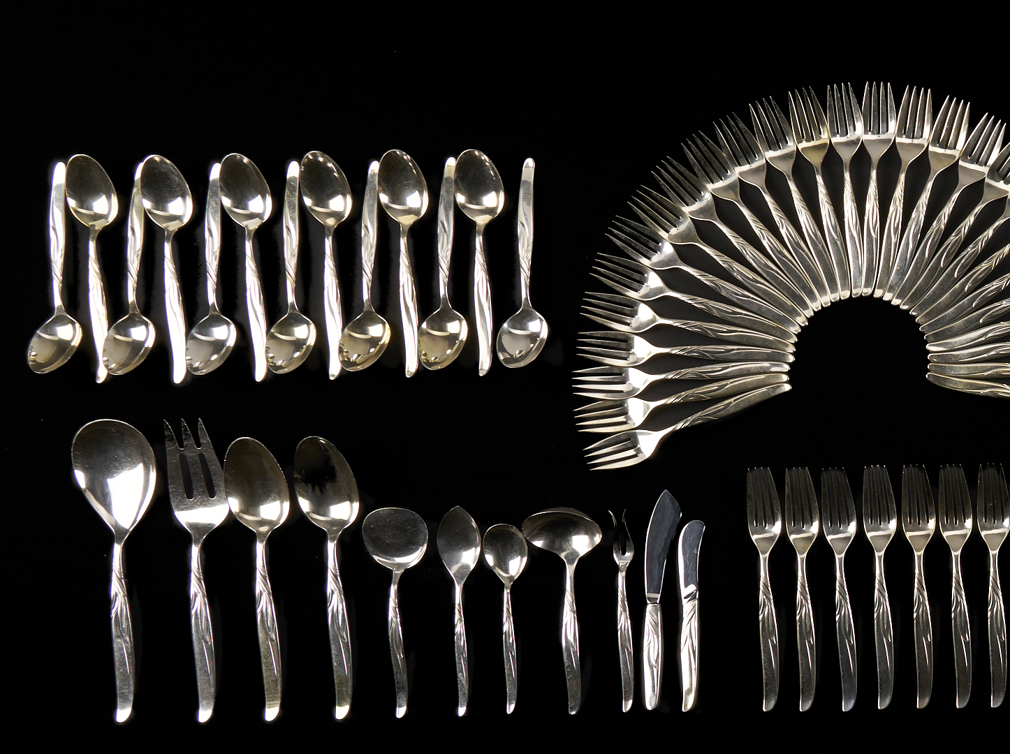 164 pieces Towle sterling silver flatware in the mid-century modern Southwind pattern (introduced 1952), basic service for 27 plus extras. Includes 27 dinner knives, 27 dinner forks, 27 salad forks, 31 teaspoons, 17 cocktail forks, 13 soup/place spoons, 11 flat handle butter knives and 1 hollow handle butter knife. Also includes 1 master butter knife, 1 large casserole serving spoon and 1 large cold meat serving fork, 2 serving tablespoons, 1 jelly knife, 1 olive/pickle fork, 1 sugar spoon, 1 gravy ladle, and 1 bon bon spoon. Combined weighable sterling: 163.51 oz troy.