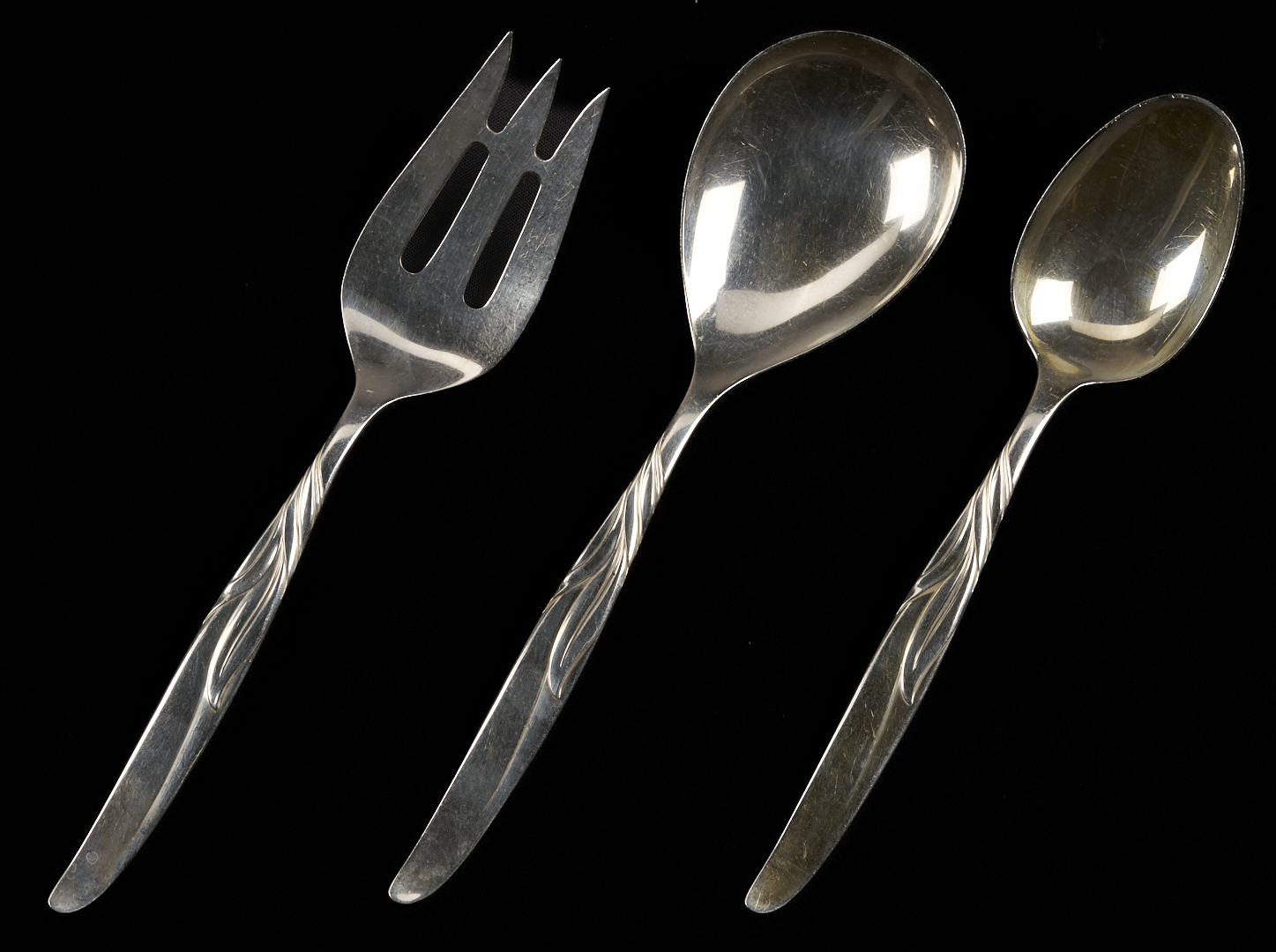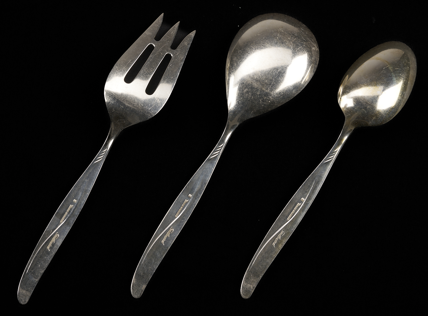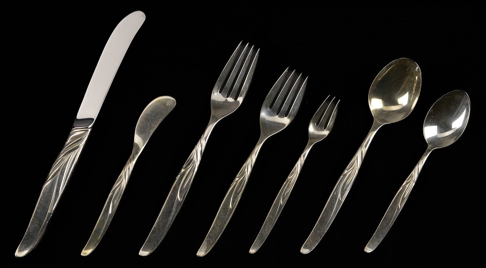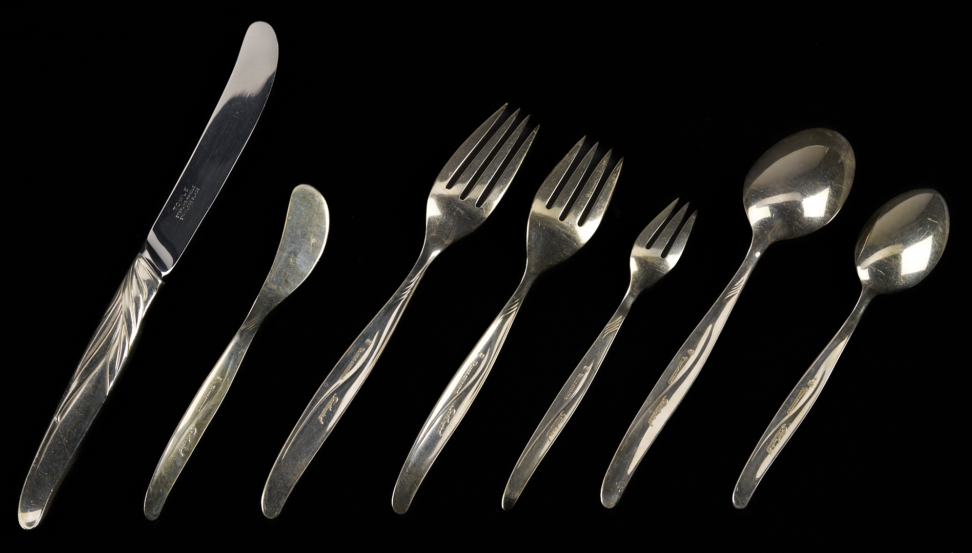 164 pieces Towle sterling silver flatware in the mid-century modern Southwind pattern (introduced 1952), basic service for 27 plus extras. Includes 27 dinner knives, 27 dinner forks, 27 salad forks, 31 teaspoons, 17 cocktail forks, 13 soup/place spoons, 11 flat handle butter knives and 1 hollow handle butter knife. Also includes 1 master butter knife, 1 large casserole serving spoon and 1 large cold meat serving fork, 2 serving tablespoons, 1 jelly knife, 1 olive/pickle fork, 1 sugar spoon, 1 gravy ladle, and 1 bon bon spoon. Combined weighable sterling: 163.51 oz troy.