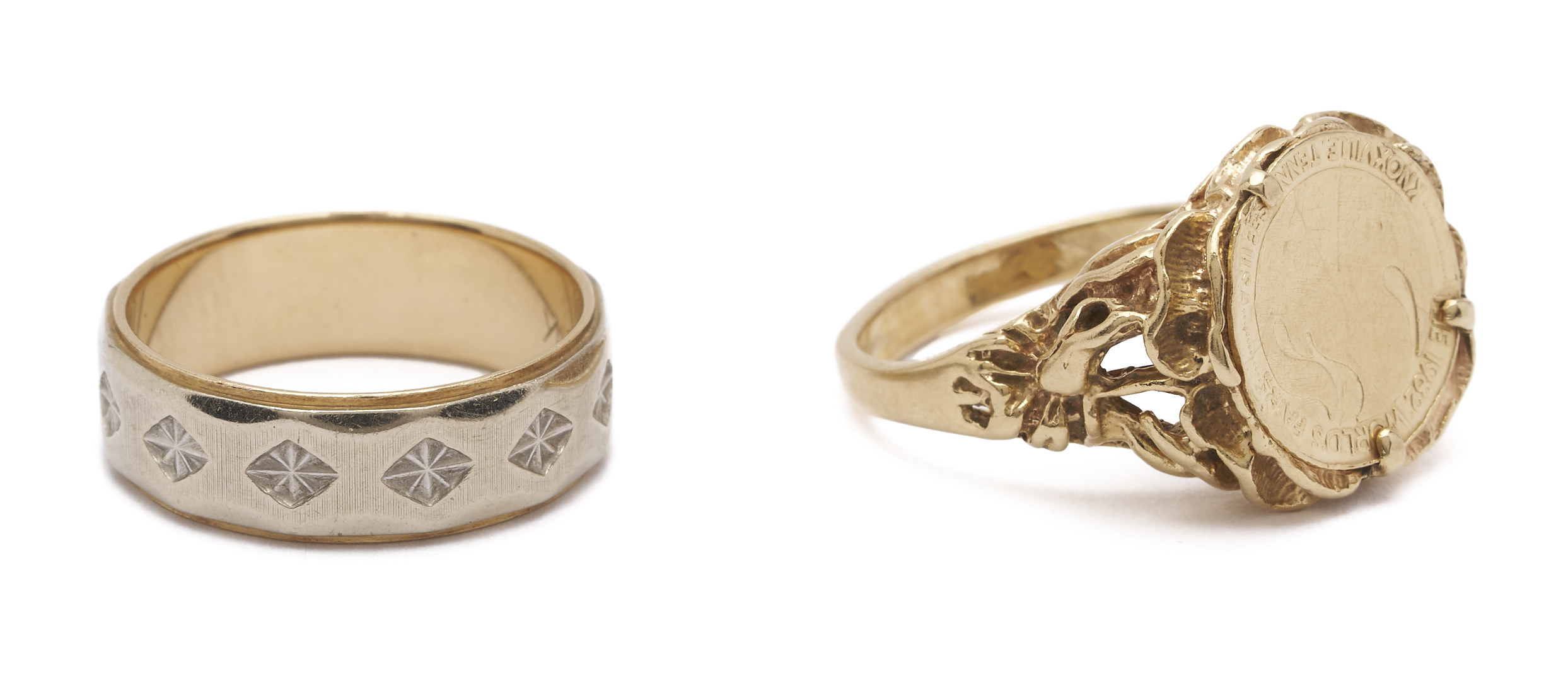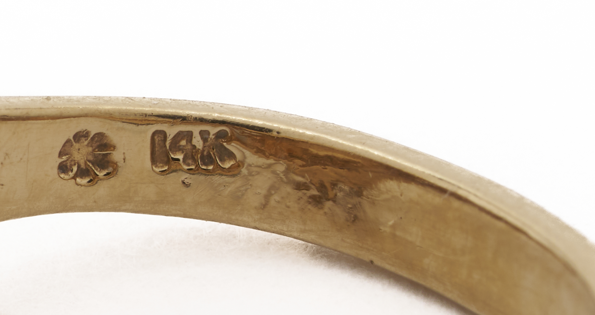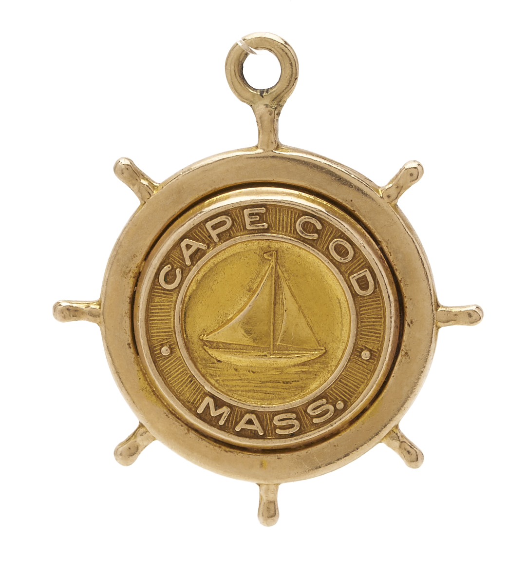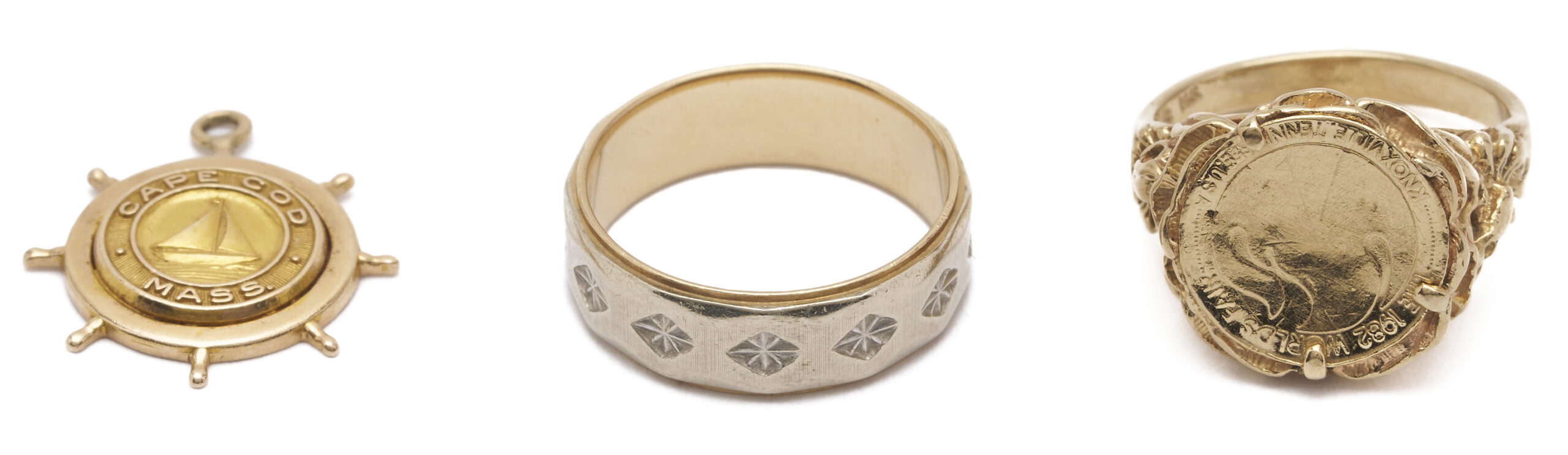 1st item: Ladies’ 14K yellow gold ring featuring one (1) 1982 Knoxville World’s Fair commemorative coin. The ring is marked “14K” and XRF tests 14K gold. The coin also XRF tests 14K gold. The ring is size 6 and has a gross weight of 5.58 grams. 2nd item: 14K yellow and white gold wedding band. The ring is marked “14K” and XRF tests 14K gold. The ring is size 7 and has a weight of 4.95 grams. 3rd item: 14K yellow gold Cape Cod, Mass. charm in the shape of a boat helm. The charm is marked “14K” and XRF tests 14K. The charm is 3/4 in. x 5/8 in. and weighs 3.48 grams. Gross weight of the lot is 14.01 grams.