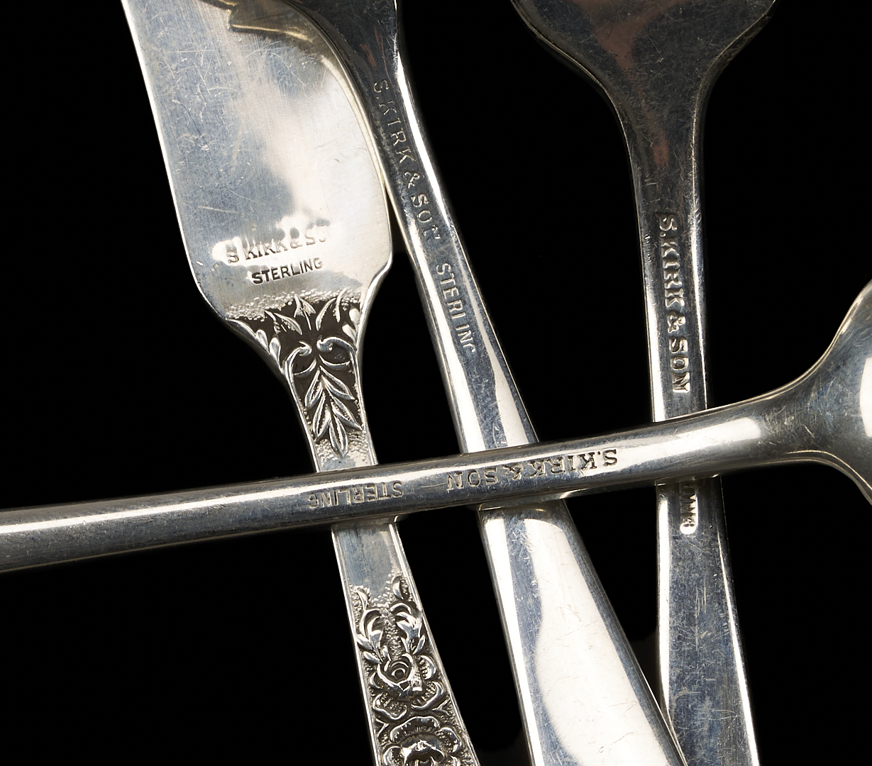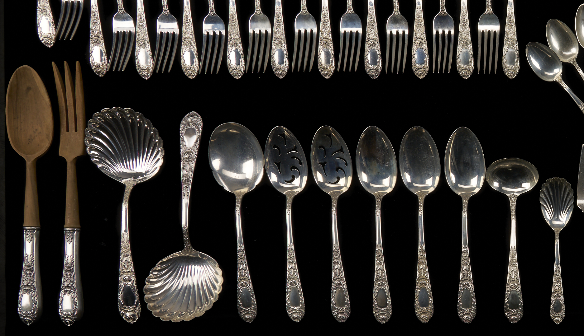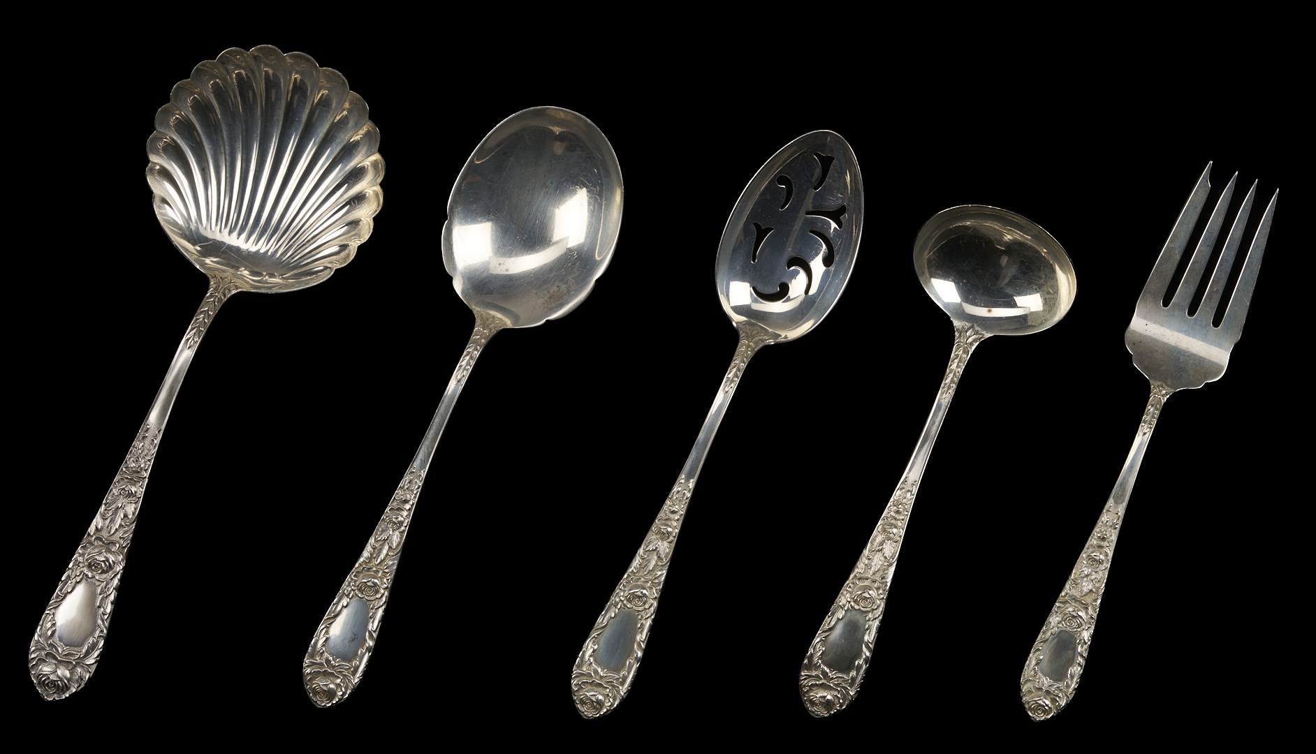 One hundred four (104) pieces of S. Kirk & Son Rose Pattern sterling silver flatware, including: 21 dinner forks (7 1/2 in. L), 14 luncheon forks, 8 cocktail forks, 8 luncheon knives (9 1/4 in. L), 16 butter spreaders, 8 soup spoons, 8 teaspoons, 8 iced teaspoons, 1 pair of wooden salad serving fork and spoon (11 1/4 in. L), 2 shell fruit serving spoons, 1 solid salad serving spoon, 2 slotted serving spoons, 3 serving spoons, 1 gravy ladle (7 1/4 in. L), 1 sugar shell spoon, 1 cold meat serving fork, 1 cheese server, 1 cheese scoop and 1 sugar tongs. Various monogrammed dates and initials throughout. Total weight: 132 oz. troy.