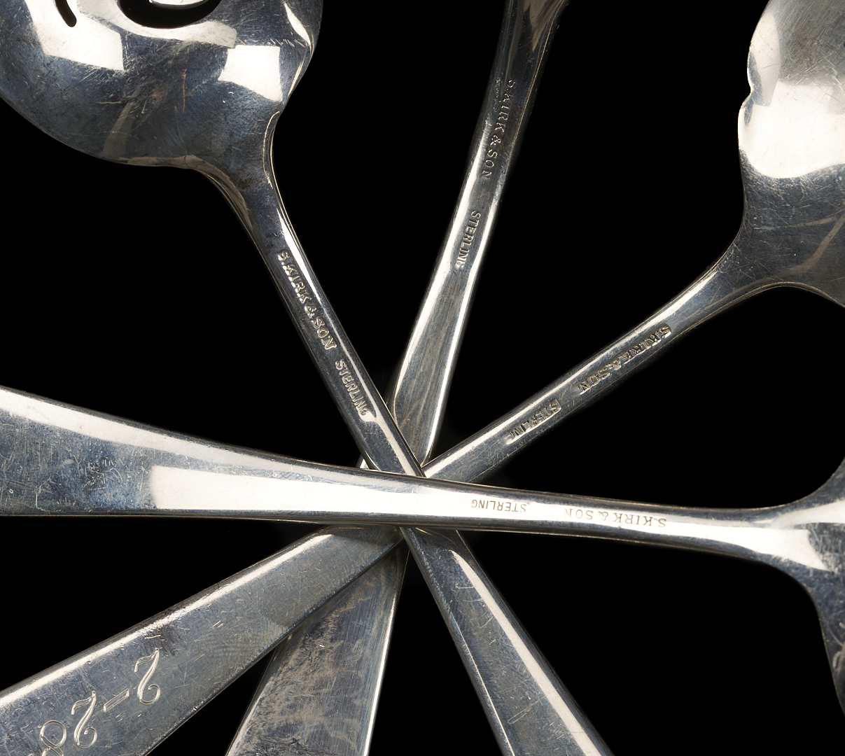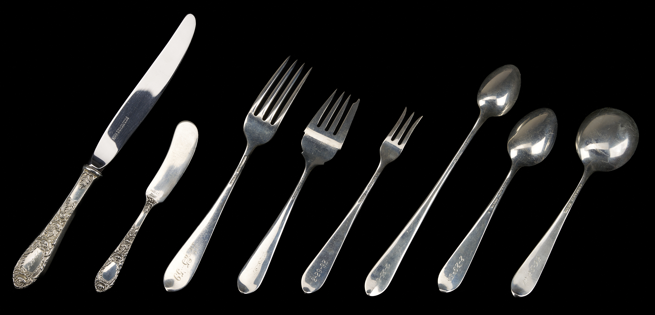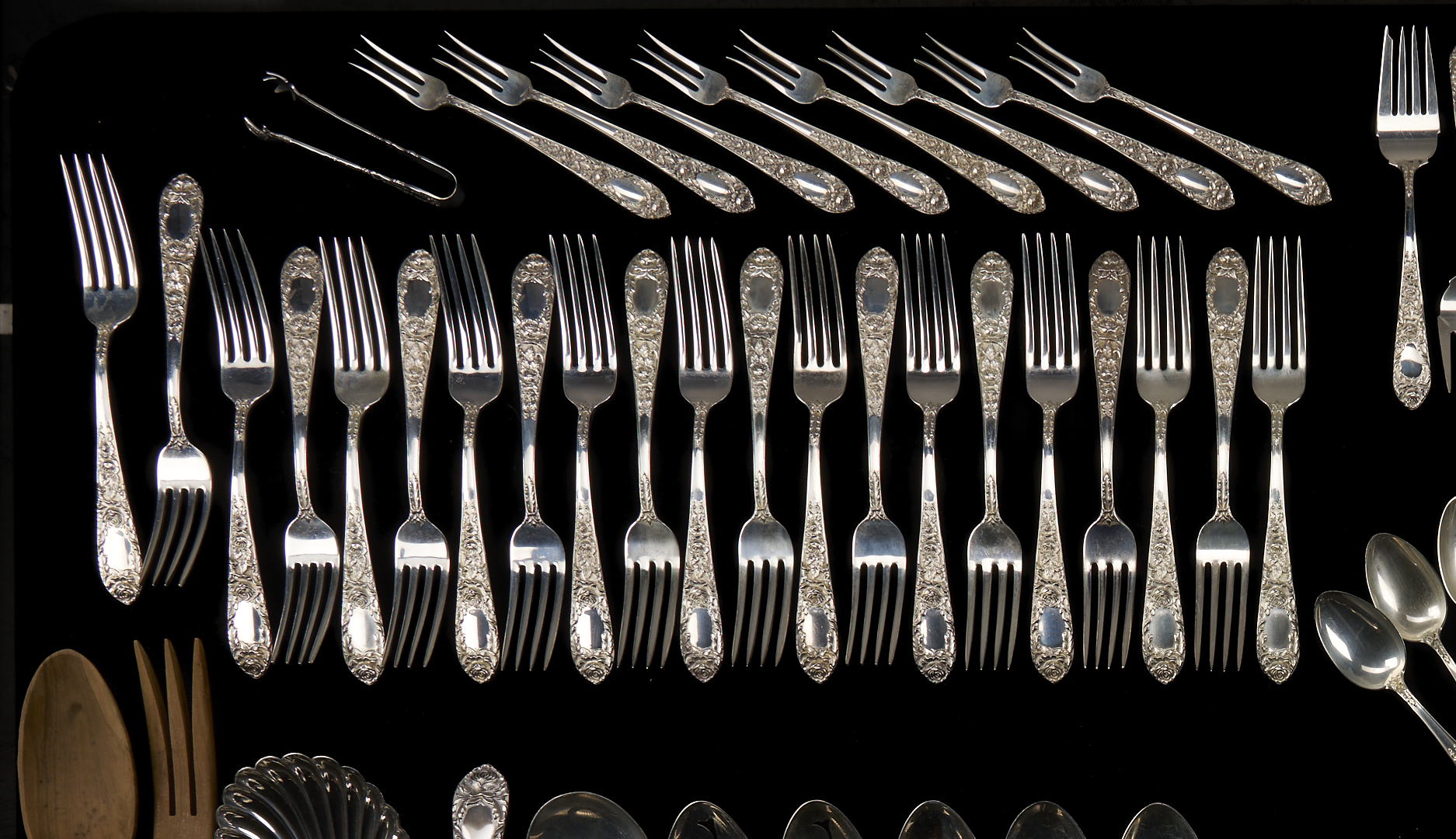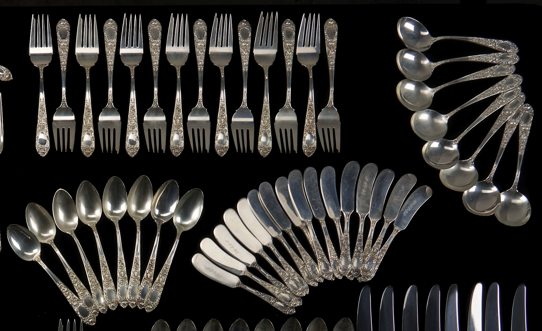 One hundred four (104) pieces of S. Kirk & Son Rose Pattern sterling silver flatware, including: 21 dinner forks (7 1/2 in. L), 14 luncheon forks, 8 cocktail forks, 8 luncheon knives (9 1/4 in. L), 16 butter spreaders, 8 soup spoons, 8 teaspoons, 8 iced teaspoons, 1 pair of wooden salad serving fork and spoon (11 1/4 in. L), 2 shell fruit serving spoons, 1 solid salad serving spoon, 2 slotted serving spoons, 3 serving spoons, 1 gravy ladle (7 1/4 in. L), 1 sugar shell spoon, 1 cold meat serving fork, 1 cheese server, 1 cheese scoop and 1 sugar tongs. Various monogrammed dates and initials throughout. Total weight: 132 oz. troy.