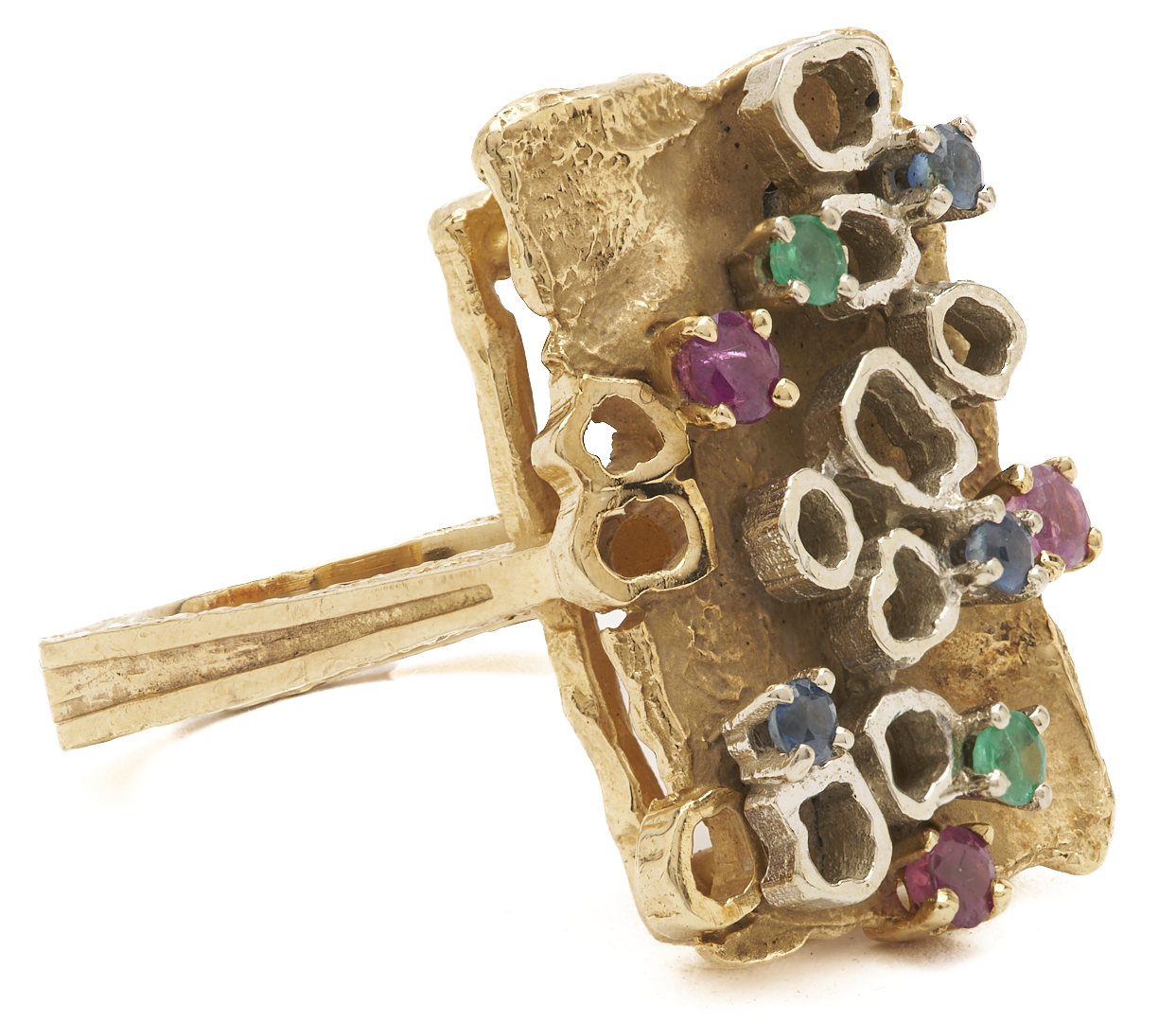 Ladies’ 14K yellow gold designer ring featuring two (2) natural emeralds, three (3) natural rubies, and three (3) natural sapphires. The ring is marked “14K SIF” and XRF tests 14K gold. The ring is size 6 3/4 and has a gross weight of 11.78 grams.