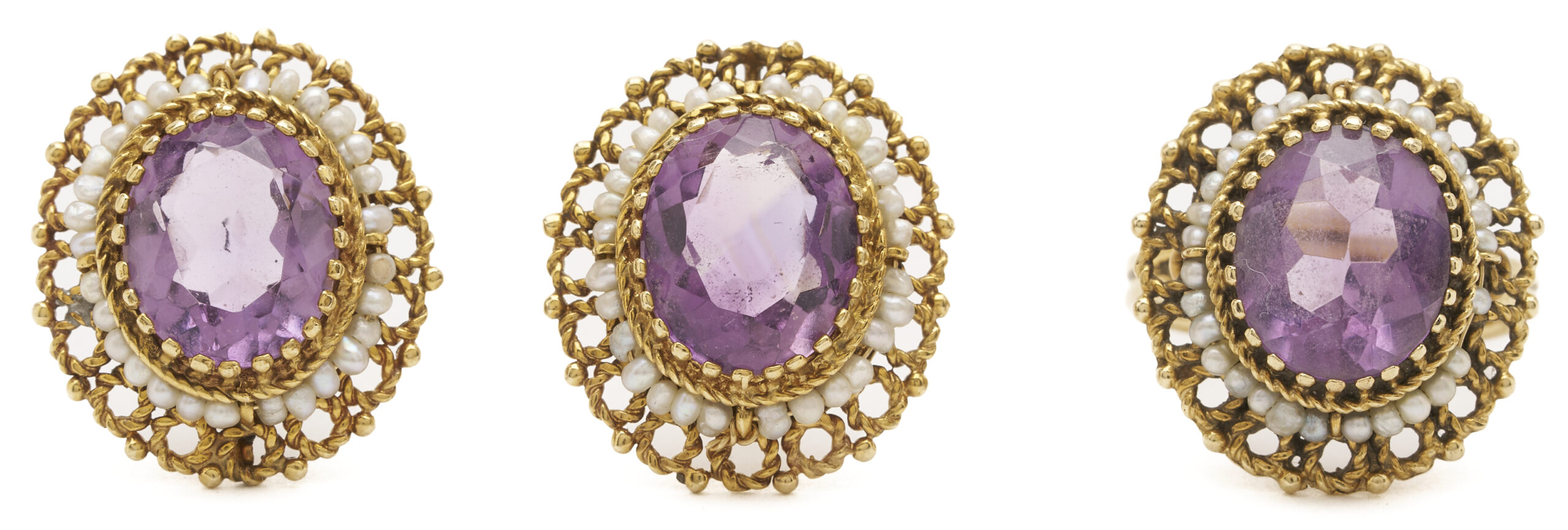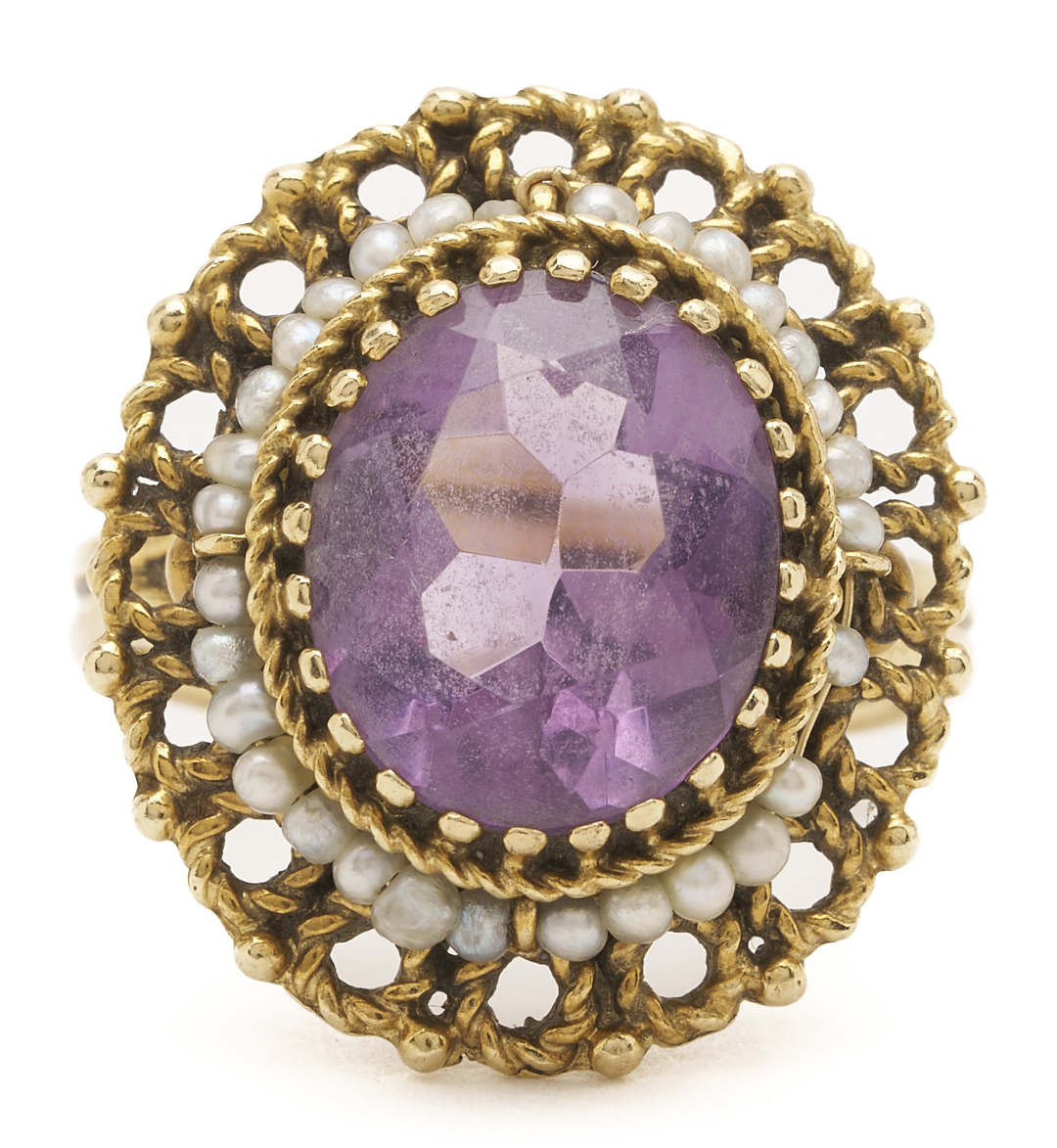 1st item: Ladies’ 14K yellow gold ring featuring one (1) amethyst accented by thirty-one (31) seed pearls. The ring is marked “14K” and XRF tests 14K gold. The ring is size 6 3/4 and has a gross weight of 7.62 grams. 2nd item: Ladies’ 14K yellow gold earrings featuring two (2) amethysts accented by sixty (60) seed pearls. The earrings are marked “14K UJ” and XRF test 14K gold. The earrings are 7/8 in. x 3/4 in. and have a gross weight of 9.77 grams without their backs which are not gold. Gross weight of the lot is 17.39 grams.