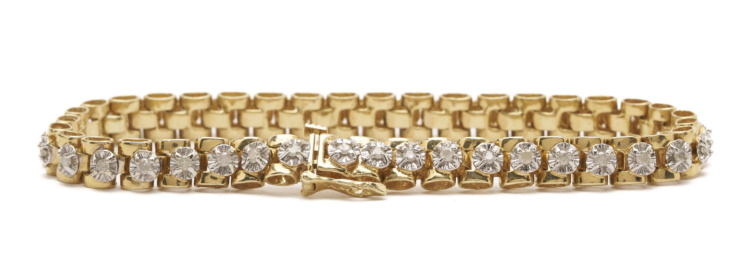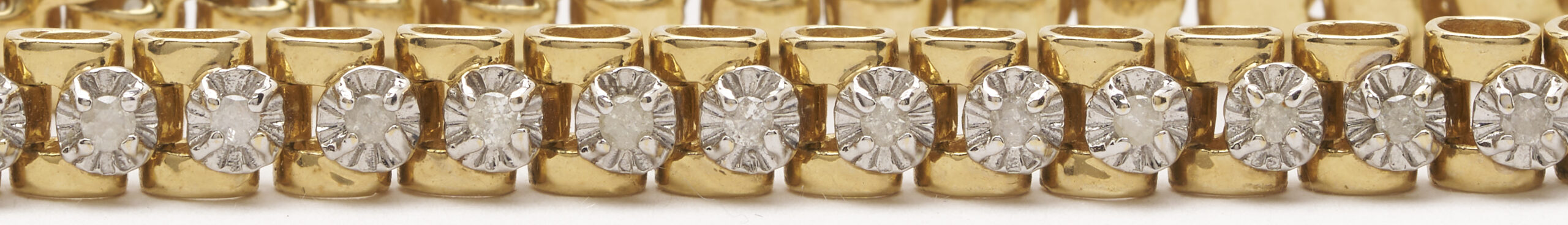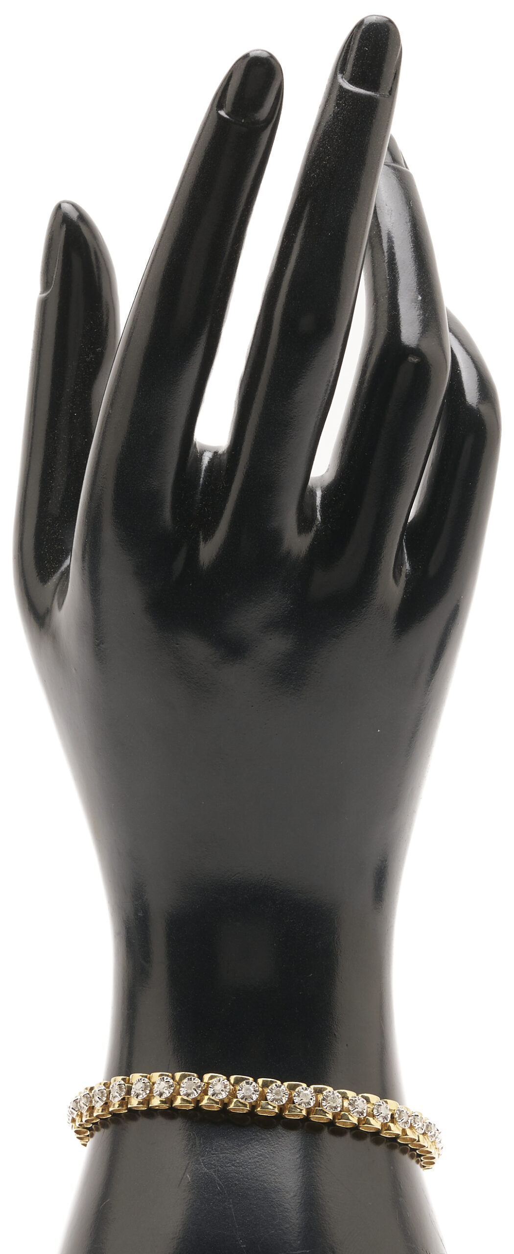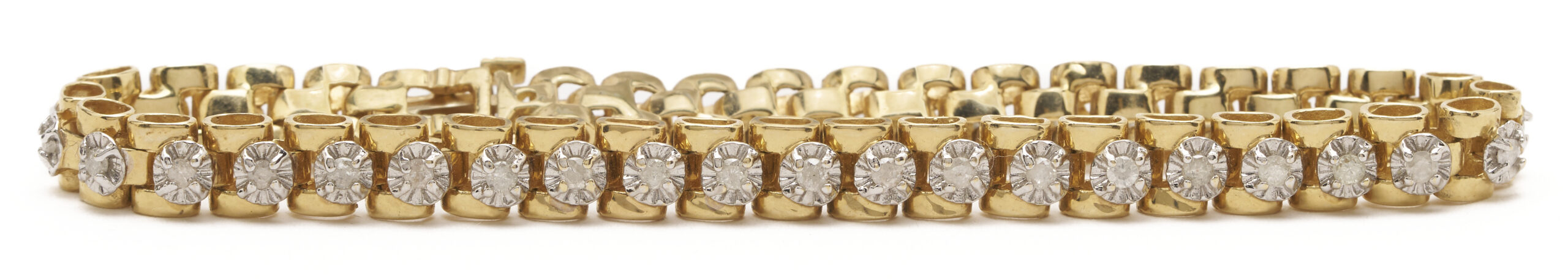 Ladies’ 14K yellow gold bracelet featuring forty (40) round brilliant cut diamonds approximately 1.20 carats together, Clarity-I3, Color-J. The bracelet is marked “14K” and XRF tests 14K gold. The bracelet is 7 in. L. and has a gross weight of 14.88 grams.