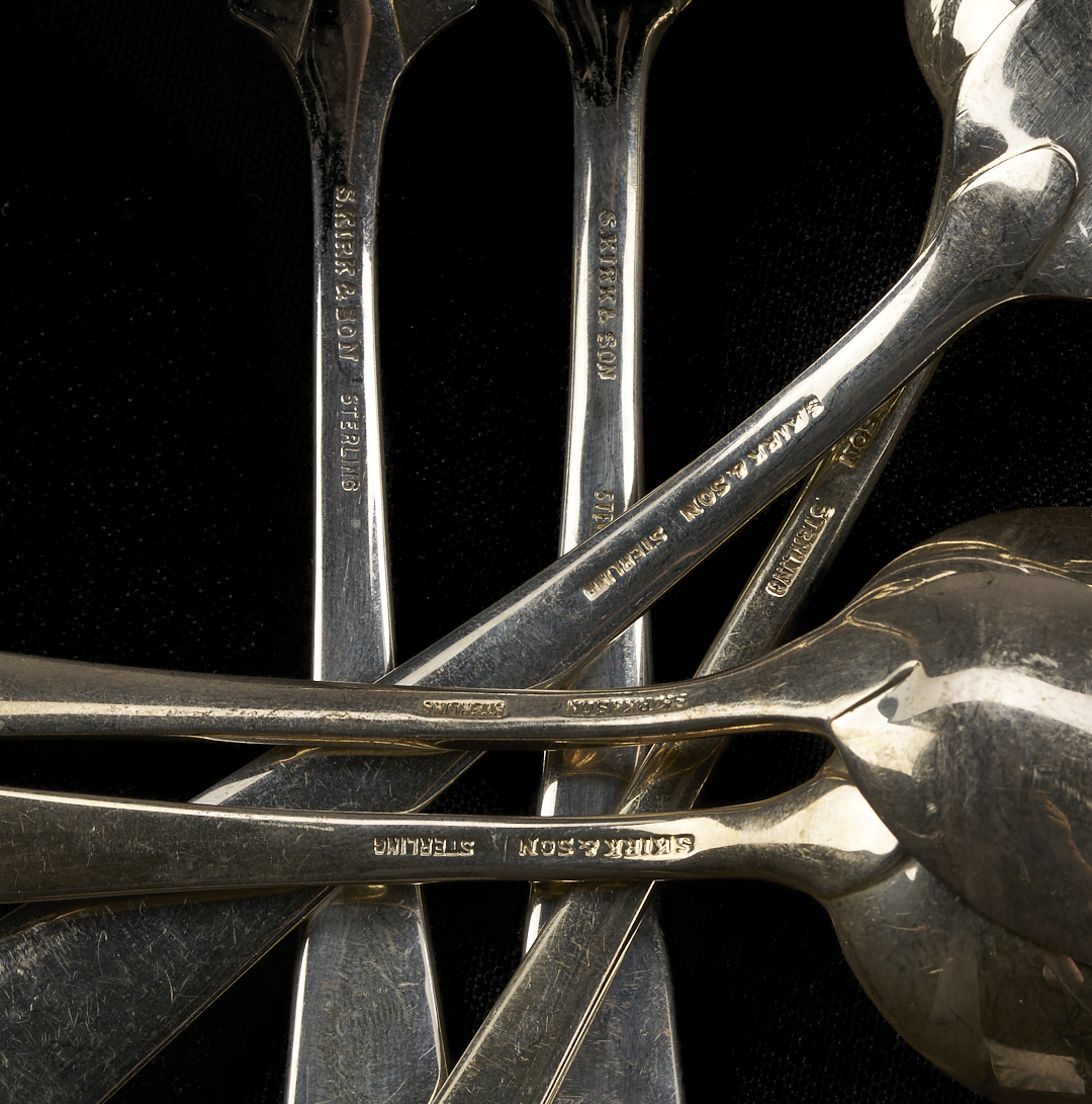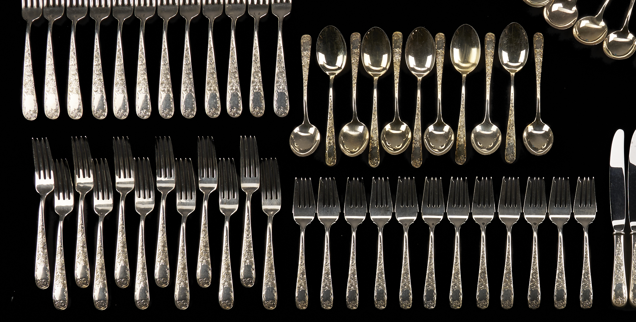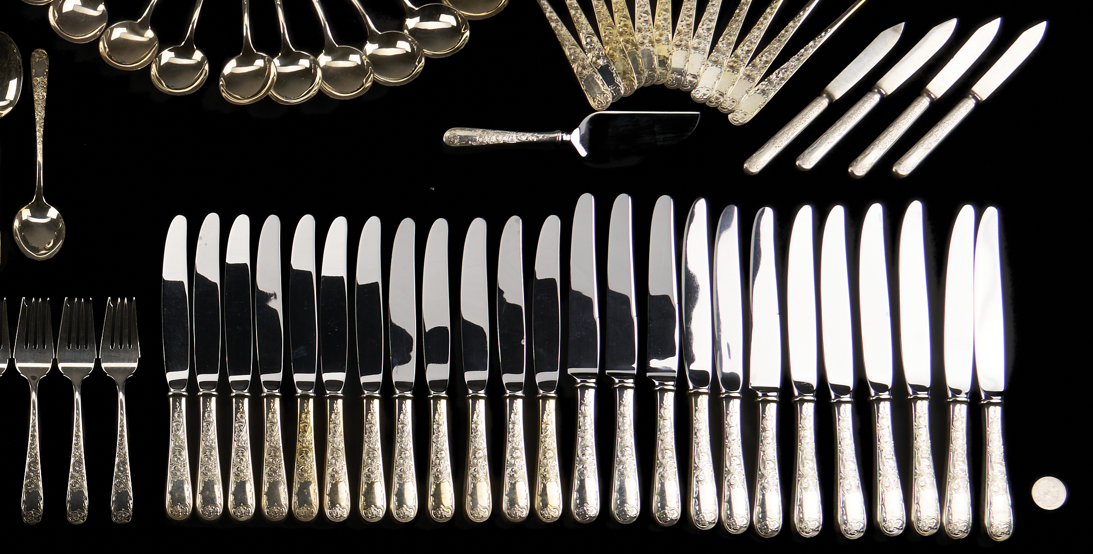 Kirk sterling pieces are in very good condition, no monograms. Some items with possible monogram removals. The 4 silverplated knives show wear, especially to blades.
