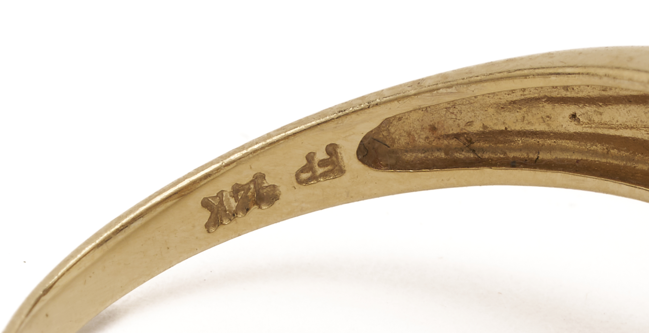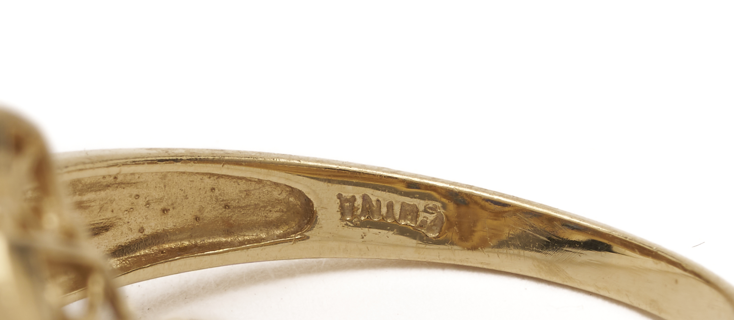 1st item: Ladies’ 14K yellow gold floral brooch featuring one (1) synthetic ruby accented by six (6) cultured pearls. The brooch is marked “GW 14K” and XRF tests 14K gold. The brooch is 1 1/8 in. x 1 1/8 in. and has a gross weight of 7.49 grams. 2nd item: Ladies’ 14K yellow gold ring featuring one (1) natural oval cut sapphire accented by eighteen (18) natural round cut sapphires and two (2) round brilliant cut diamonds. The ring is marked “14K FP China” and XRF tests 14K gold. The ring is size 10 and has a gross weight of 4.64 grams.