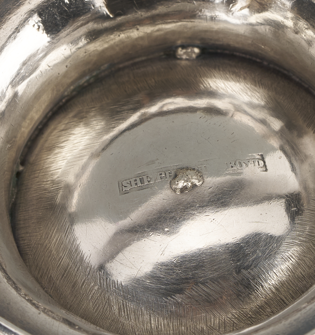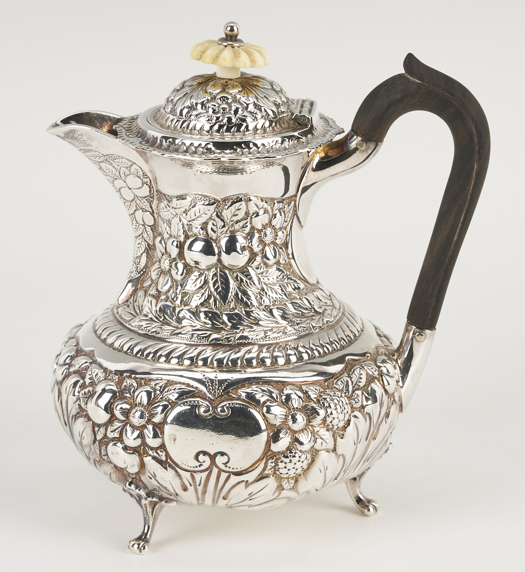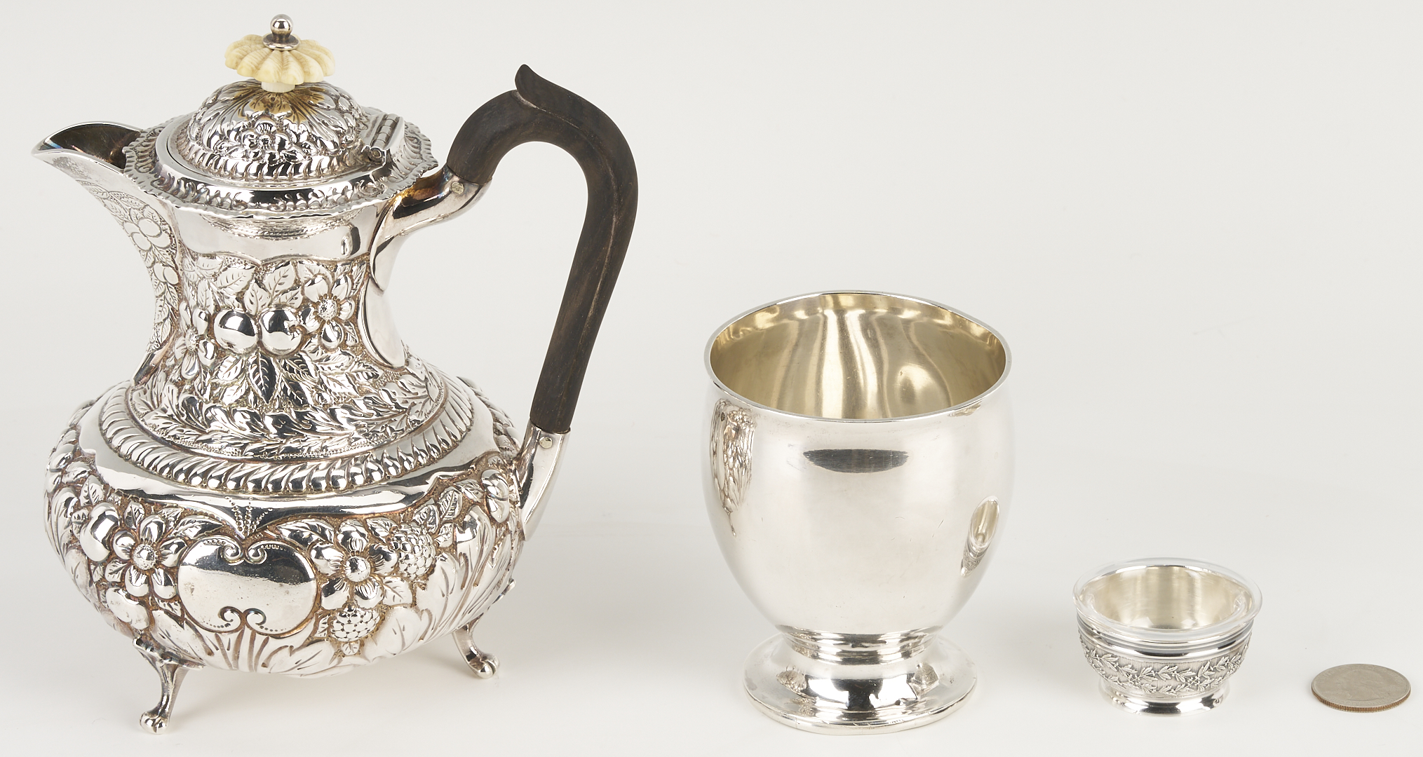1st item: English sterling silver teapot, all over repousse foliate and fruit designs, shaped wood handle, bone finial to the domed lid, all raised on three paw feet. Hallmarks for Atkin Bros., Sheffield, date mark for 1898, and retailer mark, S.D.Neill, Belfast, to the base. 7 in. H x 5 3/4 in. W. 12.55 gross troy ounces. 2nd item: Shepherd and Boyd (Albany, NY, 1806 – 1830) American coin silver goblet, marked on the base. 3 1/2 in. H. 4.47 troy ounces. 3rd item: French Maison Odiot first standard (.950) silver salt cellar, second quarter 19th century, with repousse leaf decoration to the body. Maker’s marks on the base. Fitted with a glass liner. 7/8 in. H. 0.79 troy ounces. 17.8 total troy ounces.
