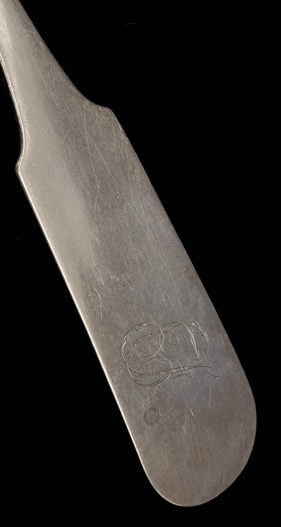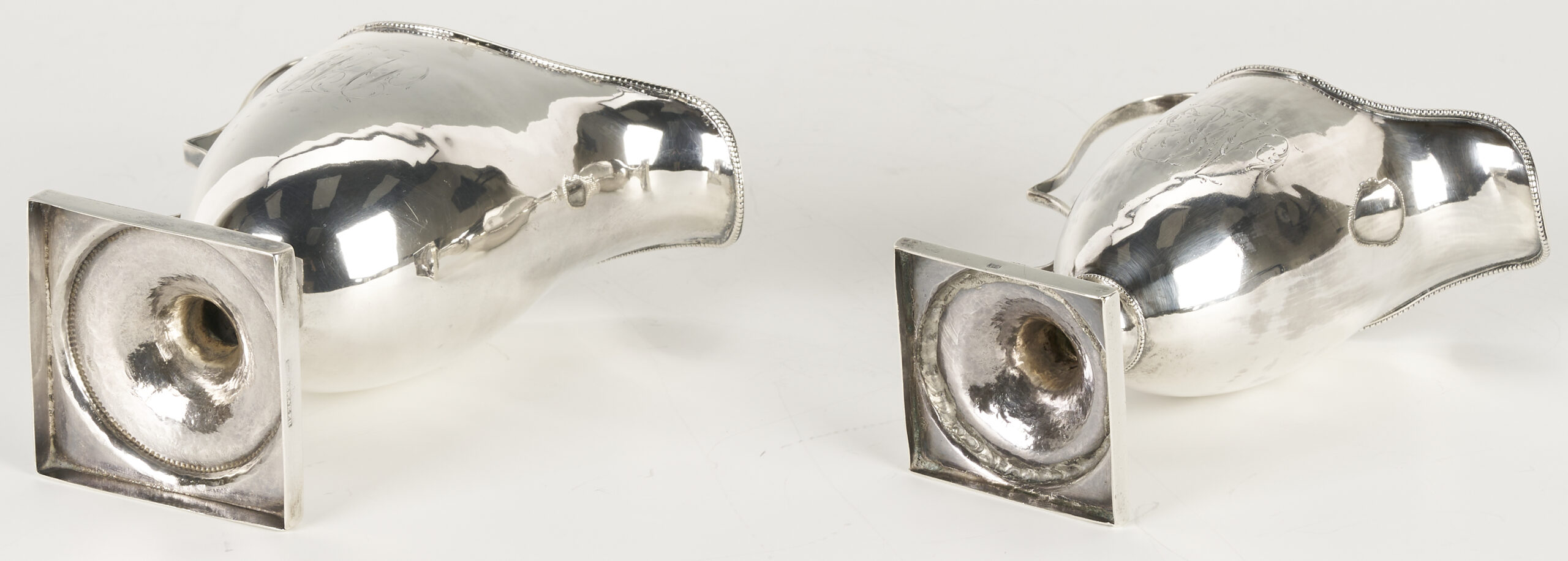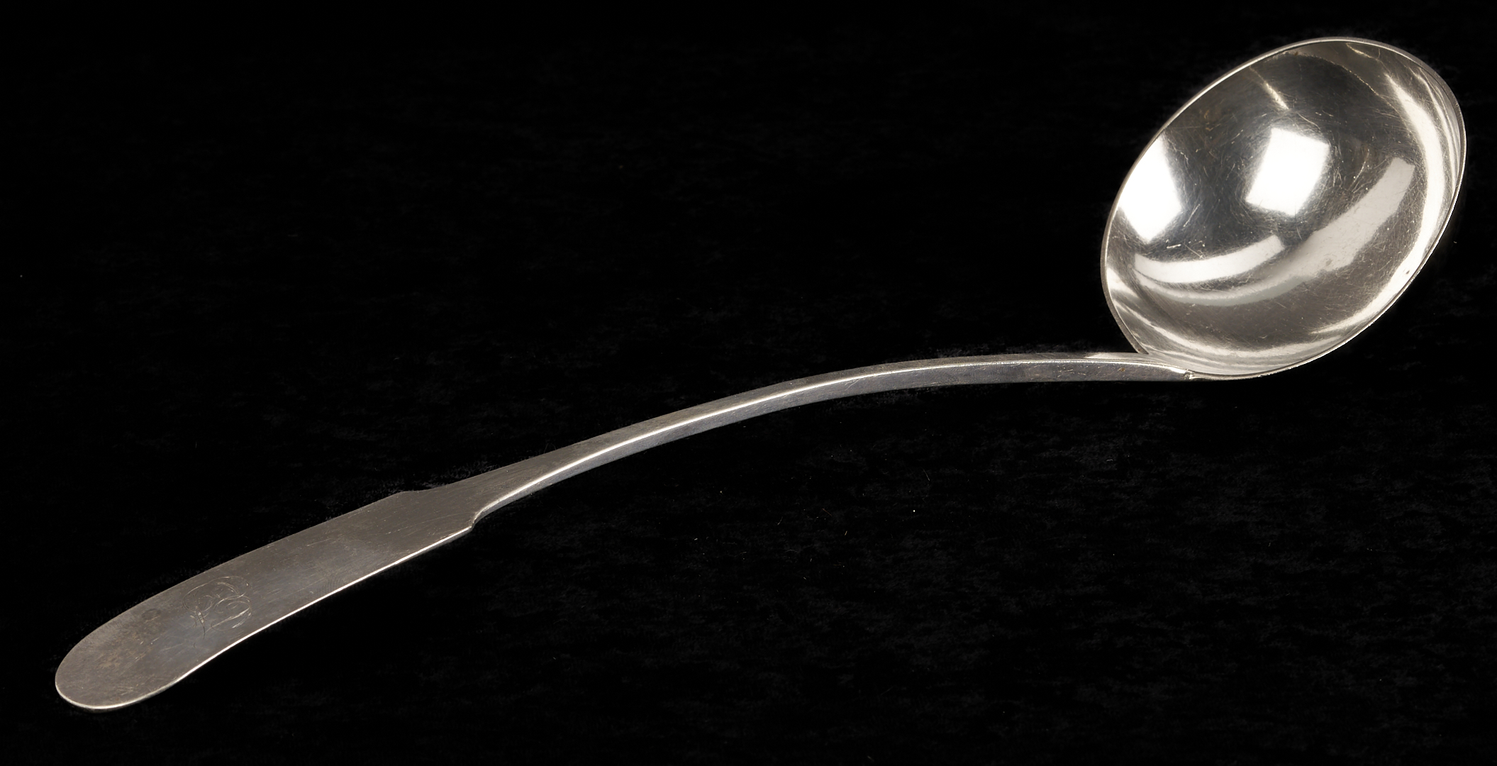 1st item: An American coin silver soup or punch ladle with plain fiddle handle, stamped WW, attributed to William Ward Jr. (Litchfield, CT, 1763 – 1826). Circa 1820. 13 1/2 in. L. 5.45 troy ounces. 2nd item: An American coin silver creamer marked on the base side JSHOEMAKER for Joseph Shoemaker of Philadelphia (working 1785 – 1829), urn form body with a beaded rim, beaded round foot, shaped flat handle, and square base. 6 3/4 in. H. 5.06 troy ounces. 3rd item: An American coin silver creamer marked on the base side “JS”, mark also used by Joseph Shoemaker of Philadelphia, urn form body with a beaded rim, beaded round foot, shaped flat handle, and square base. 6 3/8 in. H. 4.51 troy ounces. 9.57 total troy ounces.