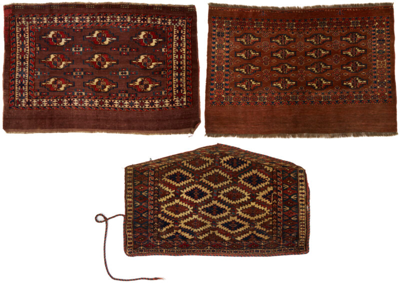 1st-2nd items: Two (2) antique Yomud or Yomut Turkmen Chuval rugs, wool on wool, both with gul designs on red fields within floral borders, woven in red, blue, and cream colors. 3 ft. 9 in. x 2 ft. 5 in. and 3 ft. 10 in. x 2 ft. 7 in. Both the last quarter 19th century. 3rd […]