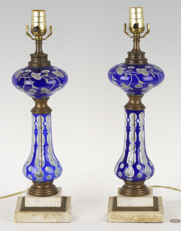 Lot 663: Pair of Victorian Cobalt Double Overlay Glass Lamps