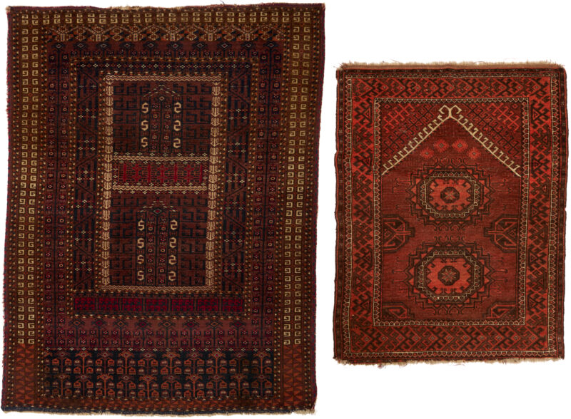 1st item: Antique Ersari Turkmen Prayer rug, wool on wool. central brick red ground “mihrab” niche with gul designs, and three primary borders. Woven in red, brown, and cream colors. 3 ft. 5 in. x 2 ft. 9 in. Circa 1890-1900. 2nd item: Antique Ersari Turkmen Ensi tribal rug, traditional central cruciform design with four panels having stylized […]