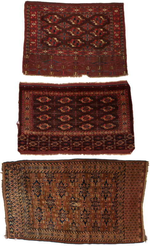 Three (3) antique Turkmen Yomud or Yomut weavings, all wool on wool and woven in colors of red, blue, and cream, including: two Chuval weavings with central gul designs, 3 ft. 8 in. x 2 ft. 9 in. and 4 ft. 5 in. x 2 ft. 9 in.) and a floor rug with central stylized geometric […]