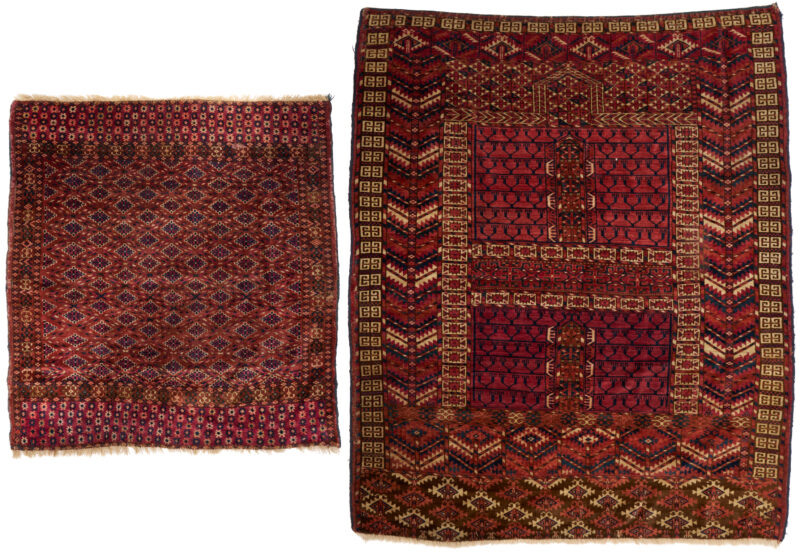 1st item: Antique Youmud or Yomut Turkmen rug, wool on wool, featuring an all-over stylized diamond design within a central red field, surrounded by three primary borders and floral element panels at each end. 3 ft.1 in. x 3 ft. 1 in. Circa 1900. 2nd item: Antique Yomud or Yomut Turkmen Ensi tribal rug, wool on wool, central cruciform design […]