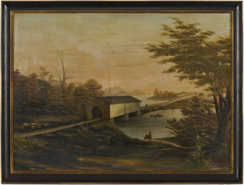 Lot 644: Manner of Thomas Chambers O/C Landscape w/ Covered Bridge, Likely New England