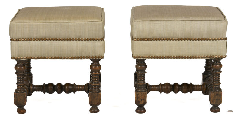 Pair of stools featuring modern taupe designer upholstery with brass nail head trim on Jacobean late 17th century ring, ball and block turned legs and stretchers, likely salvaged from period chairs. 17 in. H x 16 in. square. PROVENANCE: The estate of Michael Spalding, Nashville, TN. CONDITION: Upholstery in excellent condition. Legs are stable, but with wear, […]