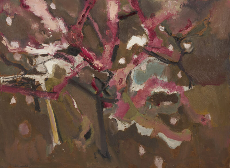 Sterling Strauser (American, 1907-1995) oil on board modernist painting titled “Peach Orchard, Flemington, NY” featuring abstracted peach trees in bright shades of pink, purple and white. Signed “Strauser” lower left and titled en verso. 36 in. H x 48 in. W. Unframed. PROVENANCE: The collection of Myron King, Nashville, Tennessee. CONDITION: Overall good condition with some edge wear […]