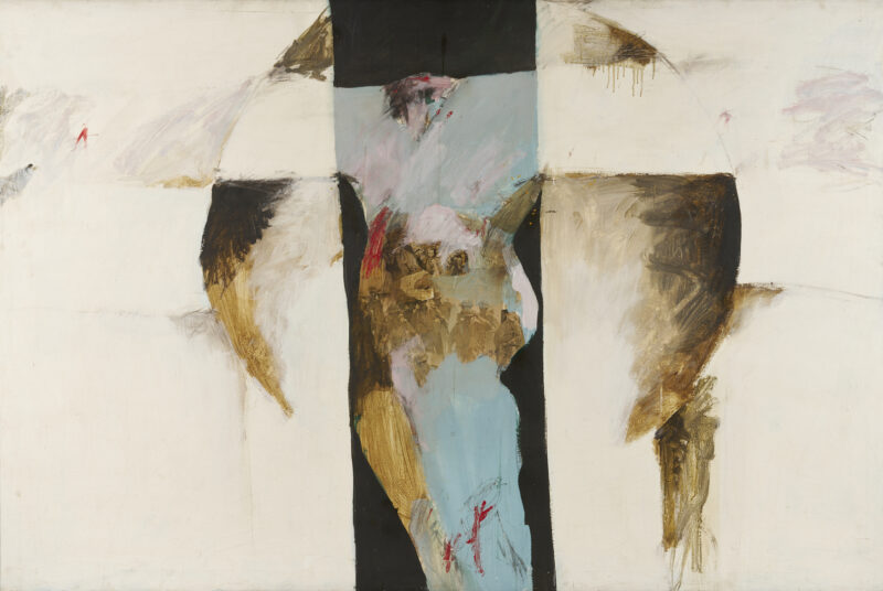 Sterling Strauser (American, 1907-1995) untitled abstract oil on canvas painting rendered in dark tones of black, brown and gray, accented by swaths of bright pale green and white. Signed “Strauser” upper right and dated 1956. Note: the consignor, who knew Strauser personally and whose father acquired it directly from the artist, believes it may have […]