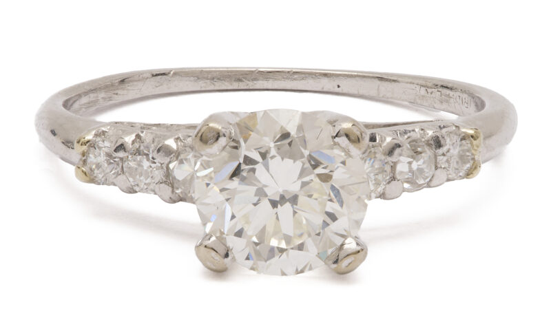 Ladies’ platinum engagement ring by Tiffany and Company featuring one (1) Euro cut diamond approximately 1.09 carats, Clarity-VS1, Color-G, accented by six (6) single cut melee diamonds. The ring is marked “Tiffany & Co” and XRF tests 90% platinum. The ring is size 5 1/2 and has a gross weight of 3.00 grams. PROVENANCE: Private […]