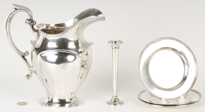 Grouping of six (6) sterling silver table items, including an American helmet form water pitcher with shaped sides and c scroll handles, four (4) International #H413 bread plates, and one (1) Fisher Silver Co. weighted bud vase. All pieces with maker’s marks and sterling marks on the base. Ranging in size from 6 in. dia. […]
