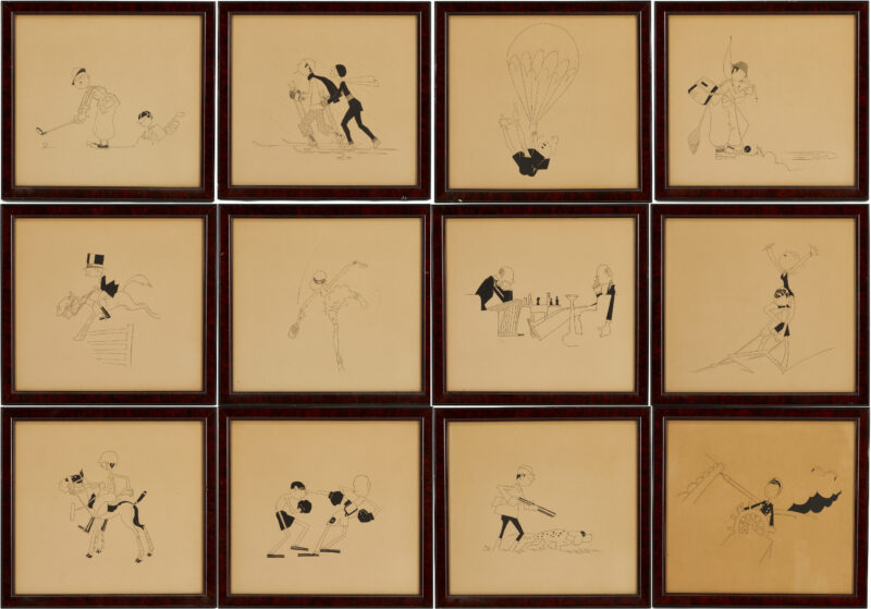 John Held Jr. (American, 1889-1958), “Outlines of Sports,” 1930, limited edition set of twelve (12) framed Art Deco era lithograph illustrations of men and women engaged in various sports including hunting, horse jumping, tennis, fly fishing, golfing, cross country skiing, parachuting, sailing, polo, boxing, waterskiing, and chess. Numbered 66/100 and signed “John Held Jr.” in ink on title plate […]