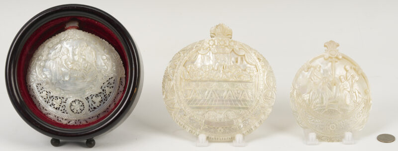 Lot 474: 3 Bethlehem Mother of Pearl Carvings incl. Nativity, Last Supper