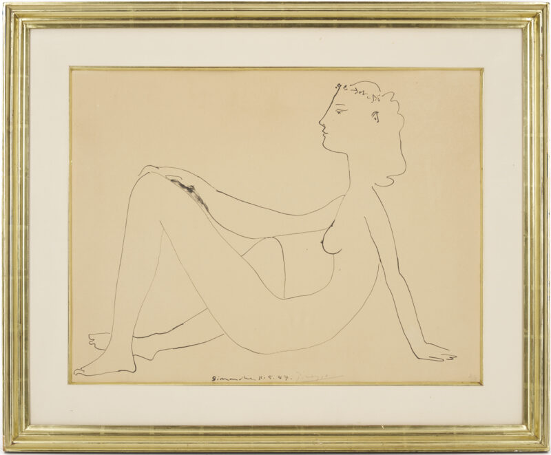 Pablo Picasso (Spanish, 1881-1973) lithograph on Arches paper, “Nu Assis, de Profil” (Seated Nude in Profile). A seated, nude woman shown in profile rests her right hand on a bent knee and supports herself with her left arm. Pencil signed lower center and numbered 31/50, lower right. From the edition of 50 plus five proof impressions. Dated […]