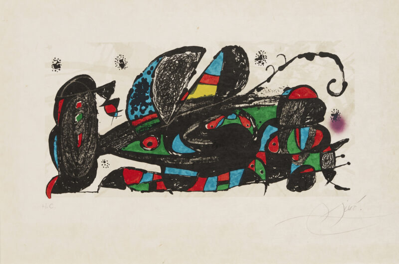 Joan Miro (Spanish, 1893-1983) abstract lithograph on Arches wove paper, “Lithograph X” AKA “Dolphin and Parrot,” from Lithographs II, 1975. Published by Leon Amiel, New York, and printed by Maeght, Paris. Signed in pencil, lower right, and numbered XXIII/LXXX, lower left. With Arches watermark, lower center. Ref.: Mourlot 1045; Cramer Books 198. Housed under glass in a metallic […]