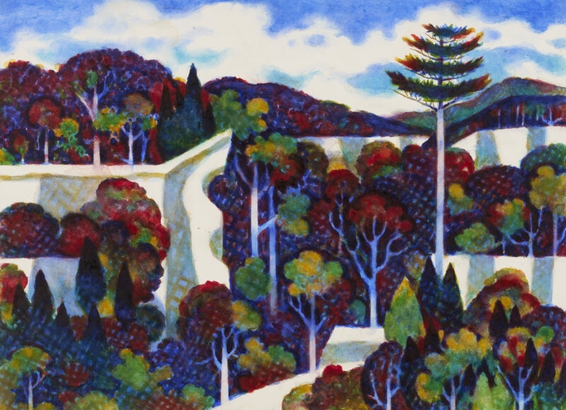 John Frederick Richardson (Tennessee/Illinois, 1906-1998) watercolor landscape painting that depicts colorful autumn foliage on Tennessee’s Cumberland Plateau, with a bright blue sky above. Some passages of pencil underdrawing visible. Unsigned. Housed under glass in a black metal frame with white mat. Sight: 21 1/4 in. H x 29 1/2 in. W. Framed: 28 3/4 in. H x 36 in […]