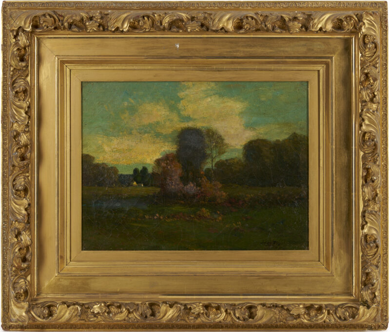 Julian Rix (American, 1850-1903), oil on canvas Barbizon / Tonalist landscape painting. Daylight illuminates a grove of trees at the center of the scene and the white walls of a cottage in the distance, distinguishing both from a shadowy treeline. The light also reflects off several white puffy clouds overhead. Signed lower right “Julian Rix” and dated 1899. Housed in […]