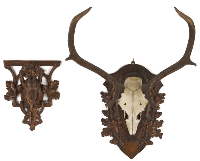 1st item: A Black Forest mounted deer skull cap and antlers mounted on a shield carved panel with acorns and oak leaves. Panel: 19 in. H x 15 in. W. Overall: 36 in. H x 26 in. W x 18 in. D. 2nd item: Black Forest carved deer or stag trophy panel. 15 in. H x […]