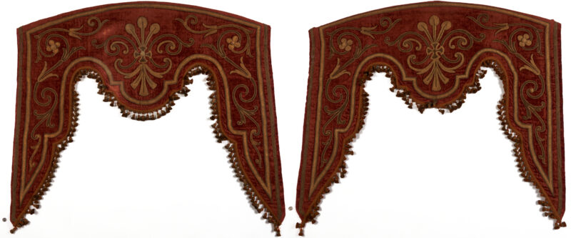 Pair of Renaissance style pelmets or drapery valances, burgundy silk velvet with appliqué raised floral scroll designs embroidered in metallic threads, and finished with tassel trim. Each with later bindings to backs. Each 59 in. W x 48 in. H. French or Italian, late 18th or early 19th century. PROVENANCE: The estate of Dr. Michael Spalding, Nashville, TN. CONDITION: Overall […]