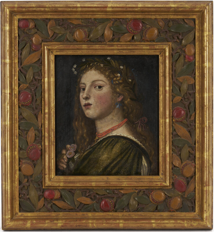 Italian school oil on canvas bust-length, three-quarters pose painting of a woman who turns to face the viewer before a dark background. A simple, gold cross pendant hangs from a red ribbon tied around her neck, and she wears a laurel chaplet and blue ribbons in her long, blond hair, with an additional red ribbon at back, along with blue ribbon […]