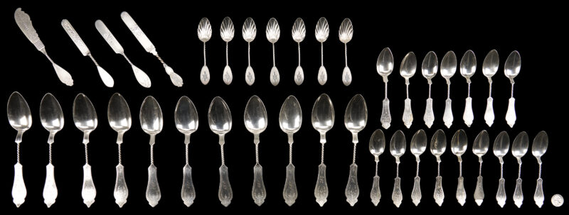 Assembled collection of 37 pieces American coin and early sterling silver flatware designed with twisted handles, including 4 assorted flat handle knives (marked for Ball, Black & Co., J.P. Brooke, and T.W. & Co.); 5 tablespoons marked for retailer B.H. Stief of Nashville; 6 tablespoons and 7 teaspoons marked for retailer C.Oskamp of Cincinnati; 6 small […]