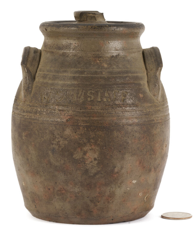 Lot 227: Exhibited East TN Grindstaff Pottery Jar with Figure Stamp