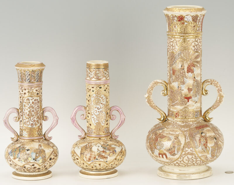 Three (3) Satsuma porcelain vases of unusual tall double handled form, all featuring polychrome enameled vignettes of court figures, the largest signed to base in gilt calligraphy. Largest vase: 18 1/2 in. H. Smaller vases: 12 3/4 in. H. Japanese, late 19th to early 20th centuries. PROVENANCE: Private Nashville collection. CONDITION: All items overall good […]