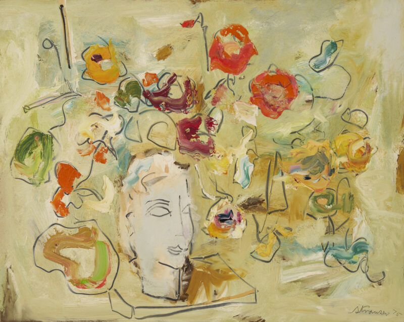 Lot 339: Sterling Strauser O/B Flowers in Figural Vase