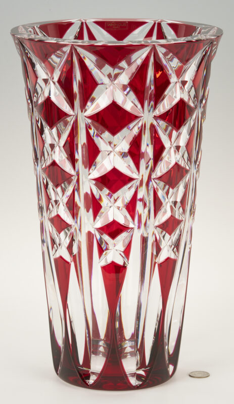 Large St. Louis, France Deauville cut glass crystal vase, ruby overlay cut to clear. Retains the original label and acid-etched stamp on the base. 16 in. H x 9 in. dia. 20th century. CONDITION: Excellent condition.