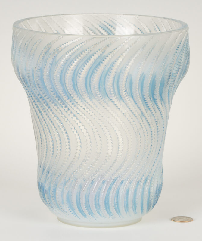 Rene Lalique “Actinia” art glass vase, designed 1934, opalescent vase with blue staining, with raised undulating bands of a notched motif. Signed (etched) “R. LALIQUE” on underside. 8 3/4 in. H x 7 1/2 in. D. Circa 1930s. 7 lbs. PROVENANCE: The estate of Elisabeth Hardin, Gadsden, Alabama. CONDITION: Excellent condition.