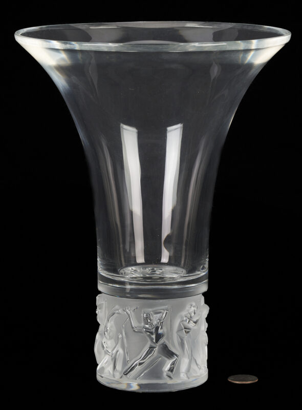 Lalique crystal flared-rim “Jazzy” vase, featuring frosted Art Deco-inspired silhouettes of dancing figures in relief around the base. Signed “Lalique France” to underside. 10 7/8 in. H x 8 3/8 in. D; 7 lbs. 20th century. PROVENANCE: The estate of Elisabeth Hardin, Gadsden, Alabama. CONDITION: Excellent condition, scratches to underside; now with felt pads.